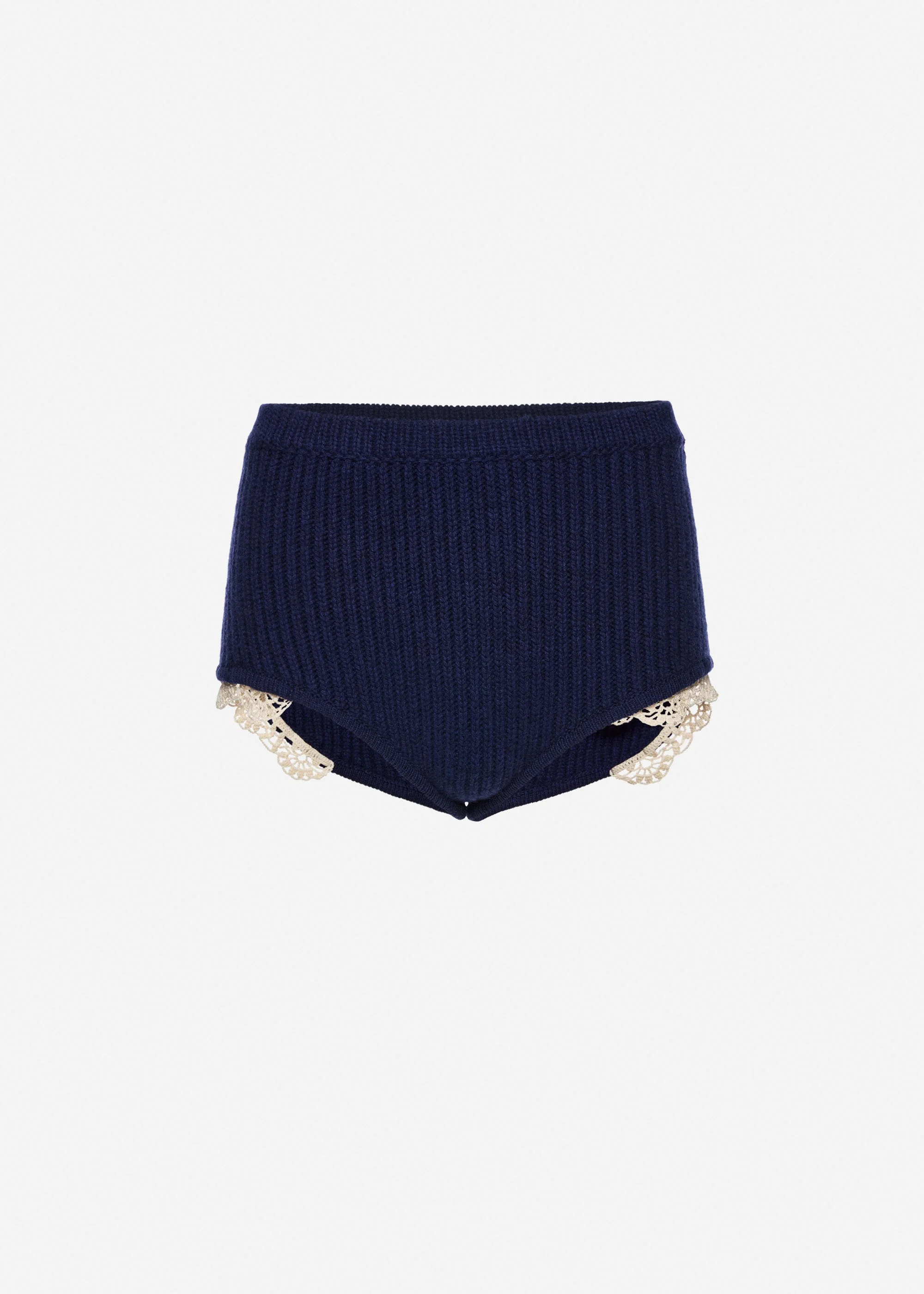 Soft cashmere knit shorts designed with an elasticated waistband and finished with delicate crochet lace trimming along the hem. Details ID: 378526 Shell 100% Cashmere Crochet 100% Cotton Sizing Model is wearing a size 34.