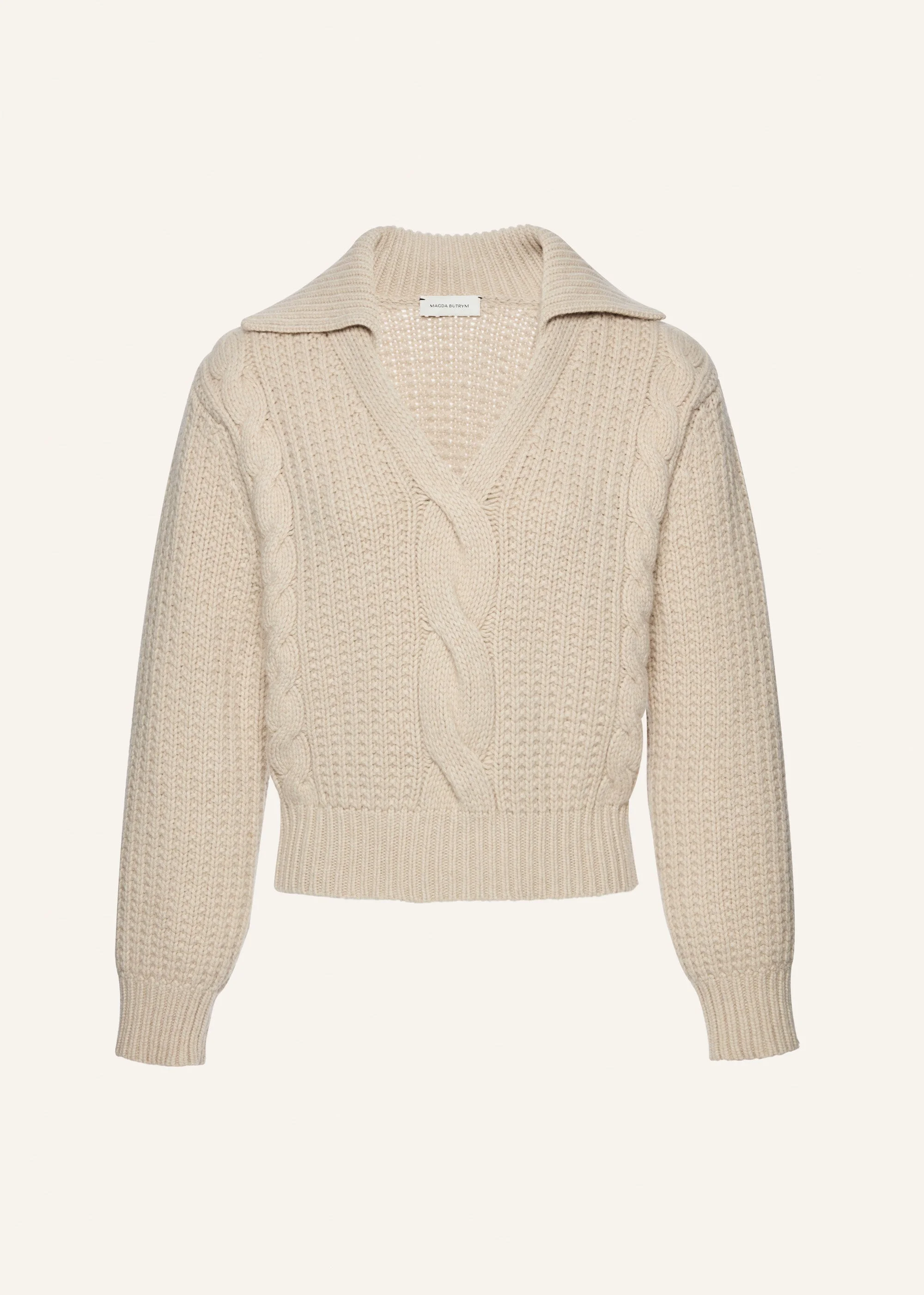 This luxuriously soft cashmere sweater is crafted in an intricate cable-knit with a relaxed polo collar and plunging V-neckline. It features dropped shoulders and ribbed trims. Pair it with matching cashmere shorts for a modern take on elevated loungewear. Details ID: 304925 Shell 100% Cashmere. Sizing This piece fits true to size. We recommend you get your regular size. Model is 177 cm and is wearing a size 34.