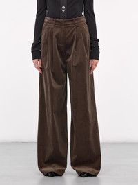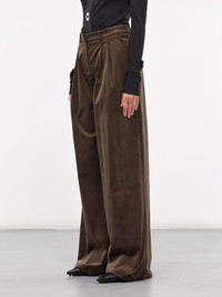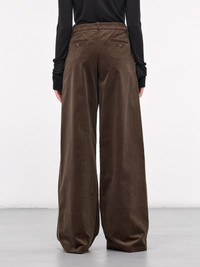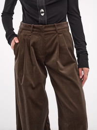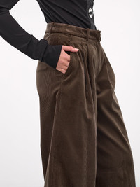 MAGDA BUTRYM pants in brown, paneled corduroy construction, belt loops, front concealed zip fly closure, pleated, inset pockets, back buttoned welt pockets, silk lining, wide leg, baggy fit. Made in Poland Outer: 100% Cotton Inner: 100% Silk French Sizing Model is 5'8" wearing size 34. Bust: 32" Waist: 24" Hips: 36"