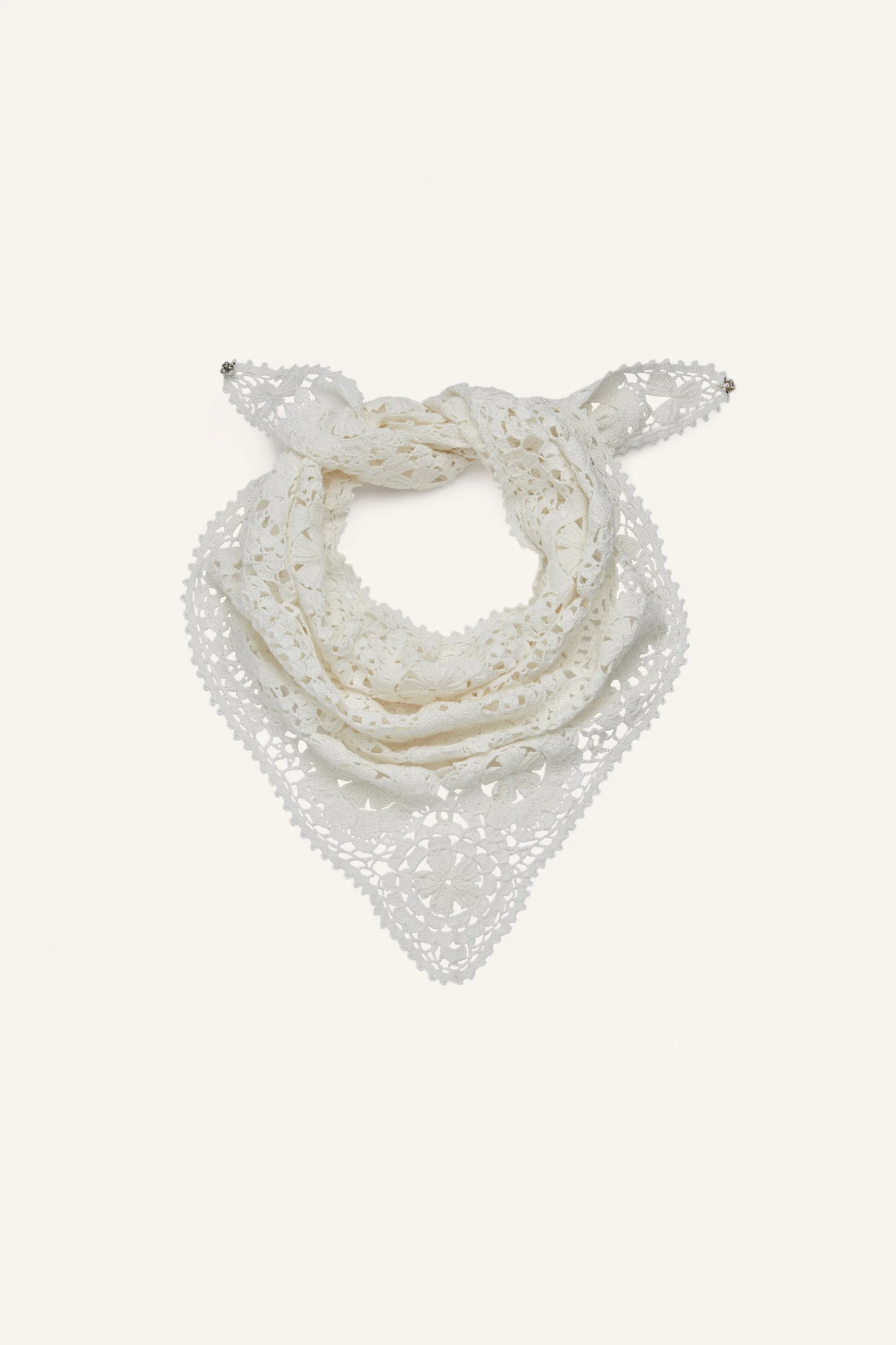 Using special traditional Polish crochet technology from Koniakow, Magda creates a new crochet line incorporating lace floral patterns. This crochet scarf is a chic way to add a very special touch to your look. The ends are embellished with a rose bead in silver. Details ID: 955724 SHELL 100% COTTON
