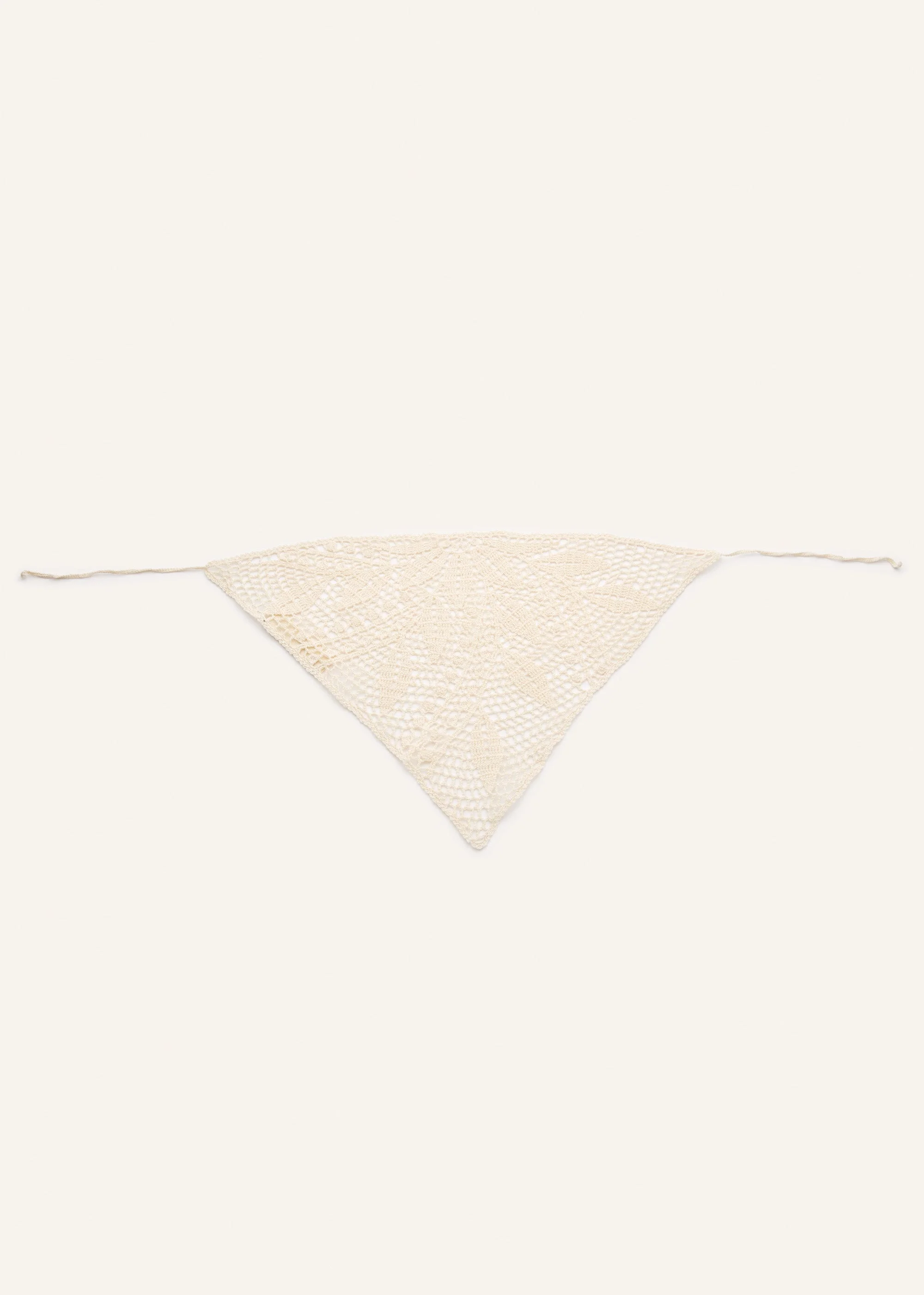 A delicate triangle-shaped scarf crafted from intricate crochet, designed with elongated ties for versatile styling. Whether worn as a headscarf or draped around the neck, this artisanal piece adds a romantic and textured finish to any look. Lightweight and effortlessly chic. Details ID: 982525 Shell 100% Cotton. Sizing Approximate measurements: 40 cm x 40 cm x 40cm.