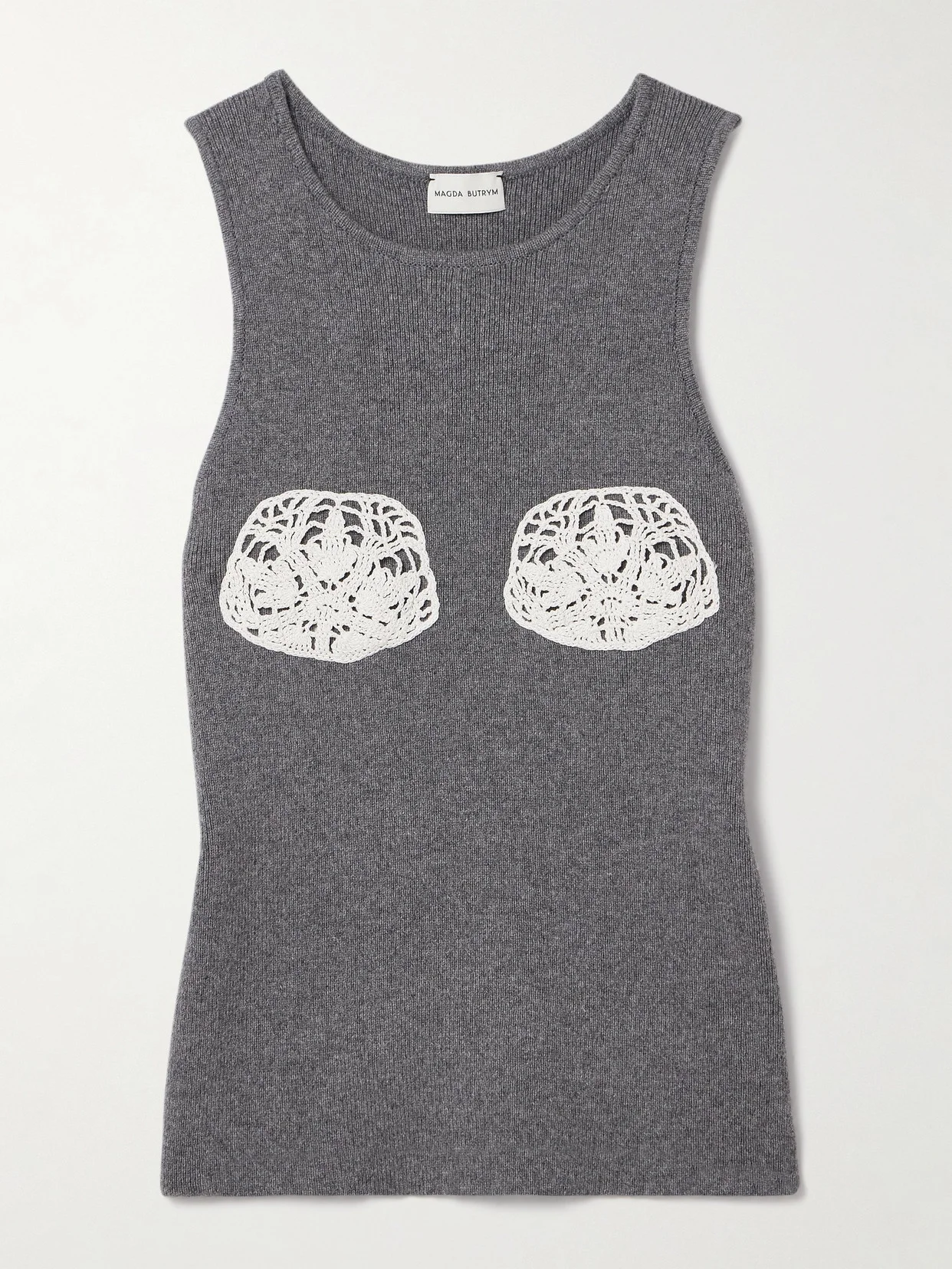 Magda Butrym is no stranger to unique embellishments - this tank is designed with intricately crocheted cotton cups. It's knitted from gray cashmere and has a slim fit that's perfect for tucking and layering. It will look so cool peeking out from underneath a blazer or jacket.