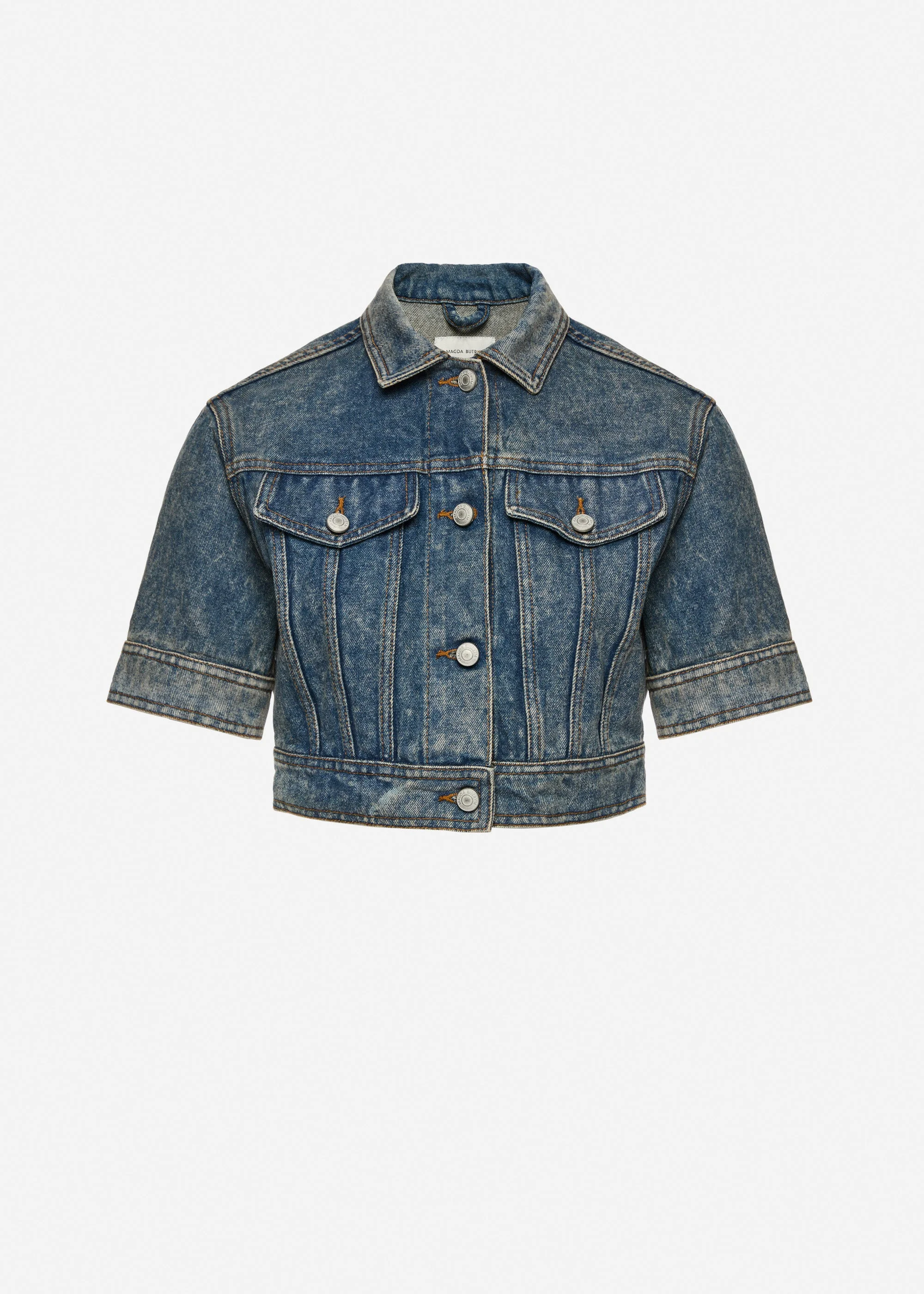A cropped denim jacket designed with short sleeves, the piece features classic chest flap pockets and a buttoned front, finished with precise topstitching throughout. The cropped length emphasizes the waist, balancing sharp construction with a casual denim attitude. A refined take on a wardrobe staple, reworked with a distinctly modern proportion. Details ID: 201526 Shell 100% Cotton Sizing This piece has a regular fit. Model is wearing a size 34.
