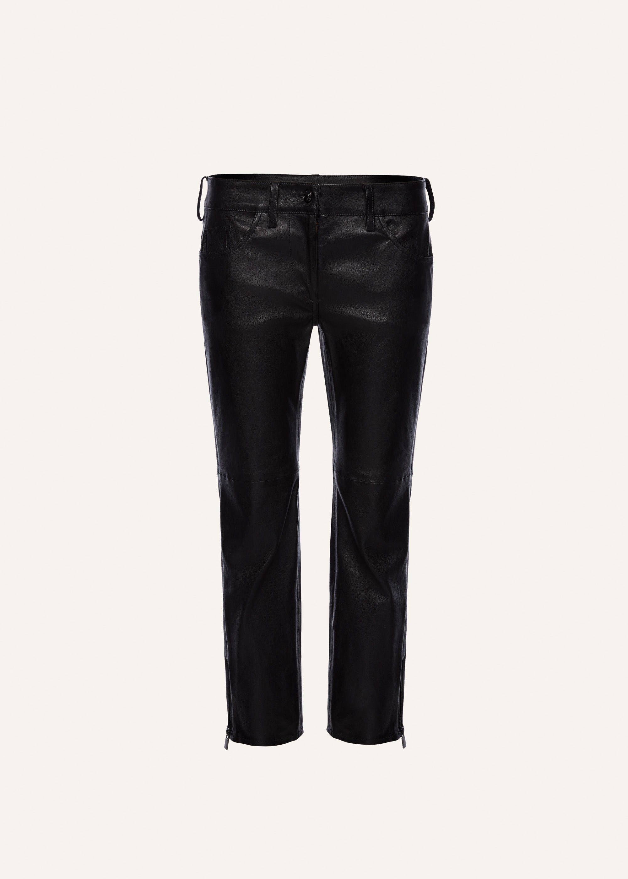 Black low-rise, skinny leather pants with ankle zips and a cropped length for a sleek, edgy style. Details ID: 242425 Shell 100% Sheep Leather. Lining 100% Cotton. Sizing This piece fits true to size. We recommend you get your regular size. Model is 180 cm and is wearing a size 34.