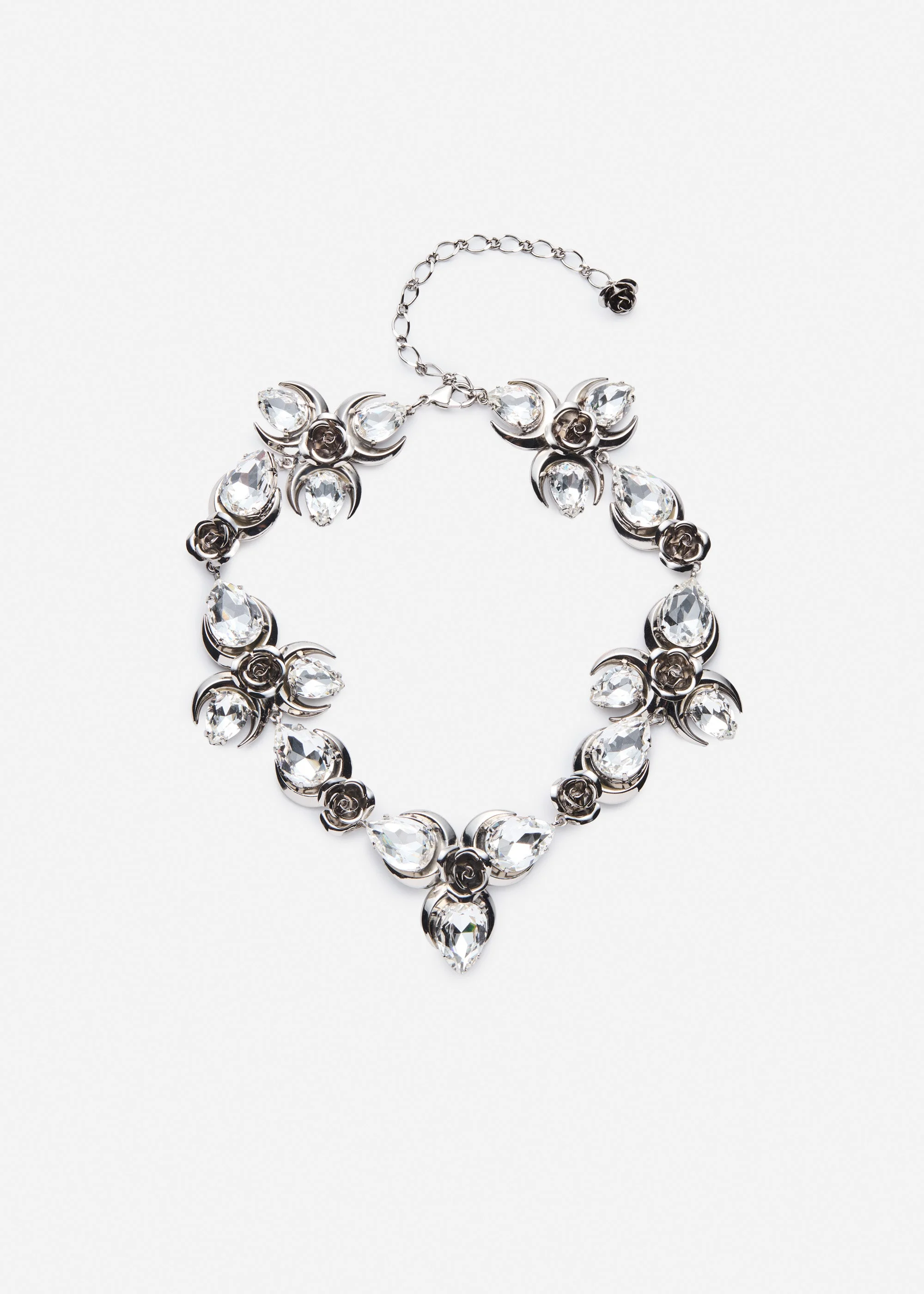 A statement necklace crafted in a polished silver-tone finish, composed of sculptural rose motifs and crescent-shaped settings adorned with clear, faceted crystals. The floral clusters are arranged in a symmetrical, collar-style silhouette that frames the neckline with luminous sparkle. Finished with an adjustable chain closure. Details ID: 626526 Hypoallergenic Plated Brass. Crystals. Sizing Approximate measurements: 35 cm to 45 cm length,