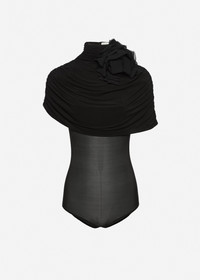 A sculptural bodysuit crafted from a soft cupro blend with stretch for a smooth, second-skin fit. The design features a ruched high collar and a delicate cape overlay that drapes across the shoulders, creating fluid volume. Fastens at the back with a concealed zip and with press studs at the crotch. Comes with a detachable flower brooch for styling versatility. Details ID: 291426 Shell 92% Cupro 8% Elastane Sizing This piece has a regular fit. Model is wearing a size 34.