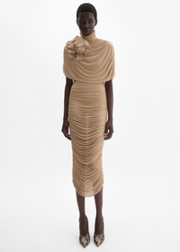 This sleeveless midi dress features a ruched high neckline and a soft draped cape detail that flows elegantly over the shoulders. A tonal flower adorns the neckline, adding a sculptural touch of femininity. Finished with a concealed zip closure at the back and an integrated bodysuit for a smooth fit. Details ID: 289426 Shell 92% Cupro 8% Elastane Sizing This piece has a regular fit. Model is wearing a size 34.