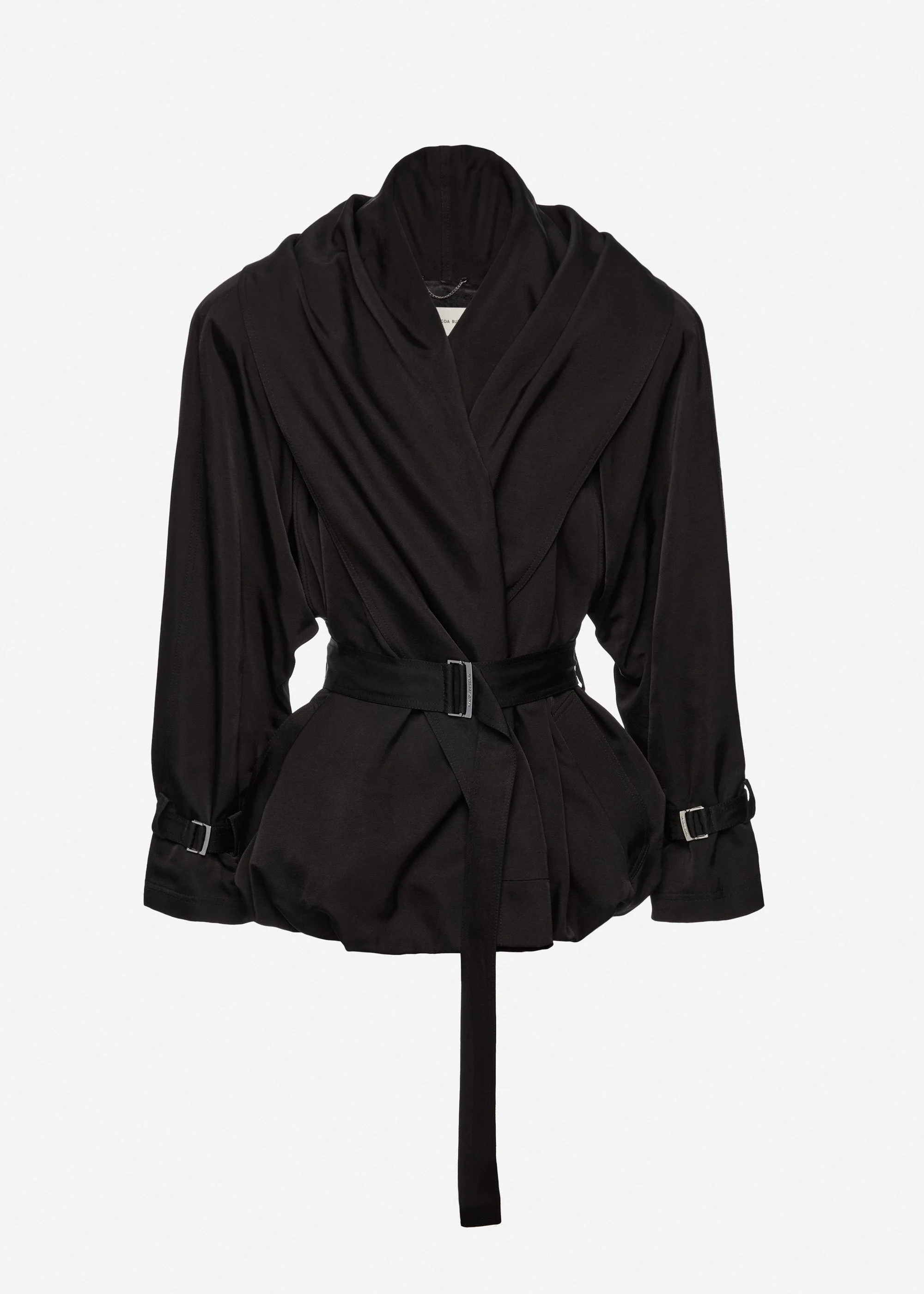 Pre-order: expected to ship by March 30th 2026 Cut to the hips, this cotton jacket features a sculptural silhouette with a hemline shaped into a soft bubble effect. Designed with raglan sleeves and a voluminous draped collar that wraps across the front, fastening only at the waist with a belt. Featuring adjustable straps with metal buckles at the cuffs and discreet welt pockets at the front. Finished with a full silk lining Details ID: 315526 Shell 51% Cotton 49% Silk. Lining 100% Silk. Sizing This piece fits true to size. We recommend you get your regular size.
