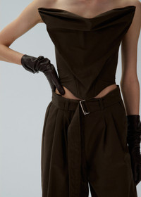 A strapless corset in brown with a pointed-edge bustier shape, detailed with soft draping along the neckline and a structured, panelled body for a refined silhouette. Details ID: 215425 Shell 71% Cotton 29% Polyamide. Lining 100% Silk. Sizing This piece fits true to size. We recommend you get your regular size. Model is 180 cm and is wearing a size 34.