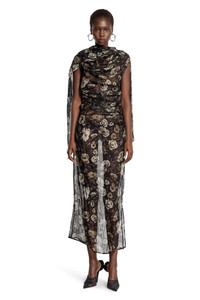 DESCRIPTION - Black - Rose print - Silk chiffon - Draped cape overlay - Ruched - Sleeveless - Slim fit DETAILS - Made in: Poland - Composition: 100% Silk - Model code: 253725 BLACK - Item ID: 9706232480086 SIZE & FIT Model wears size 38 Model Height 180 cm Bust 77 cm Waist 57 cm Hips 97 cm