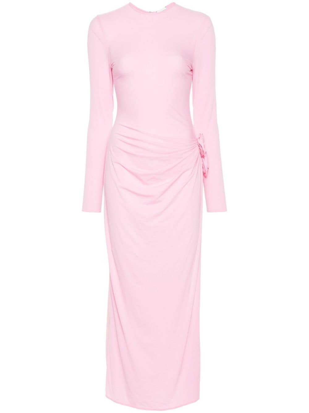 floral-appliqué asymmetric dress Magda Butrym's romantic aesthetic is translated into ruched textures and blooming embellishments, as demonstrated by this pink dress. Cut from stretch-jersey to a longline silhouette, it is adorned with gathering at the hip, where it meets voluminous 3D flower appliqués. Highlights - Bubblegum pink - Stretch-design - Crew neck - Long sleeves - Floral appliquã© - Ruched detailing - Internal logo tag - Long length - Asymmetric hem - Concealed rear zip fastening Imported Composition Polyamide 87%, Spandex/Elastane 13% SIZE & FIT Model measurements Height 5 ft 9 in(1.75 m) Bust/Chest 32.67 in(83 cm) Hips 35.03 in(89 cm) Waist 24.8 in(63 cm) FittingInformation Designed for a close fit throughout Made from a lightweight stretch fabric, this piece offers elasticity and flexibility when worn This piece fits true to size – take your usual size