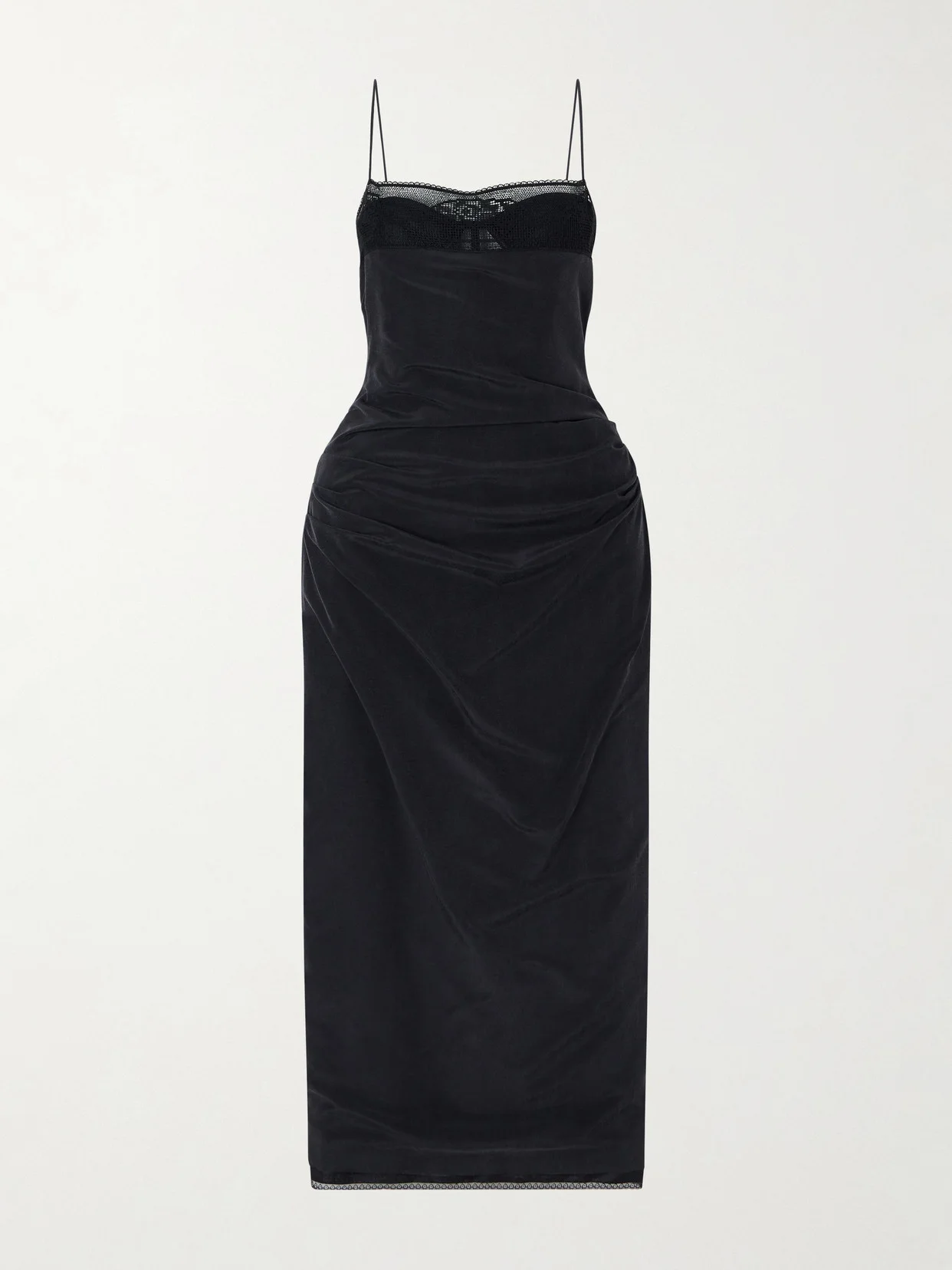 Magda Butrym's dress has a sensual feel. Cut from silk-satin in a corset-inspired silhouette, it's detailed with delicate draping, padding and a lace trim along the neckline. Wear yours with pared-back jewels and a bold red lip.