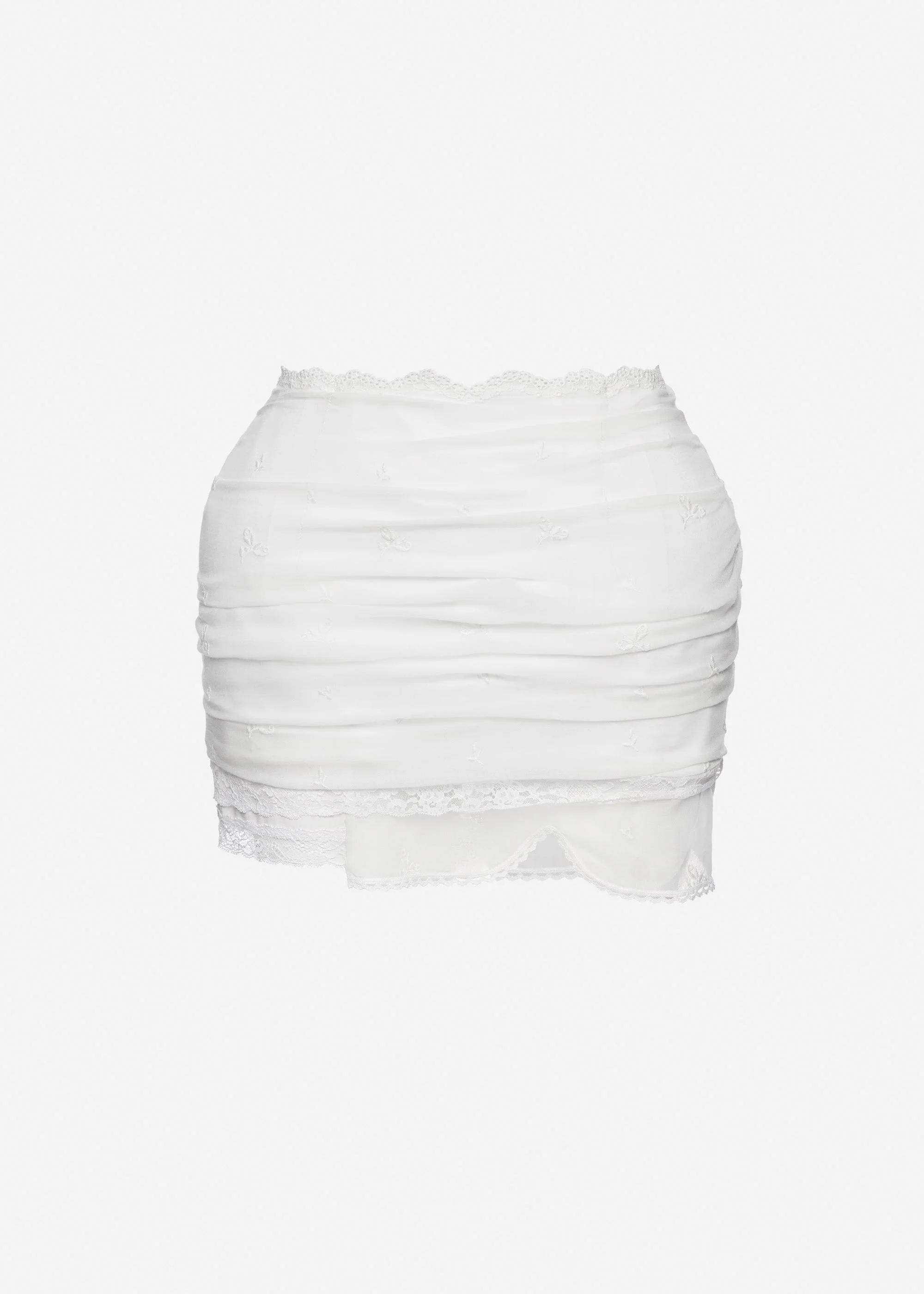 Draped mini skirt with lace trim in white