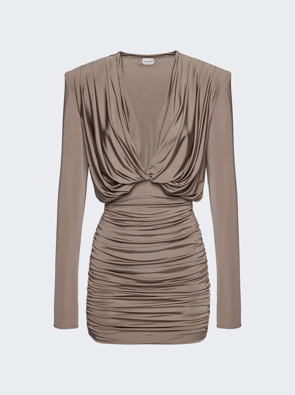 Details - Long sleeves - Removable shoulder pads - A fitted mini skirt - All over ruching - Topstitching Dimensions: Model is 5'9"/175cm and is wearing a size FR36 Composition: 95% Viscose, 5% Elastane Care: Care according to label Brand Style: 187524 Designer/Brand: MAGDA BUTRYM
