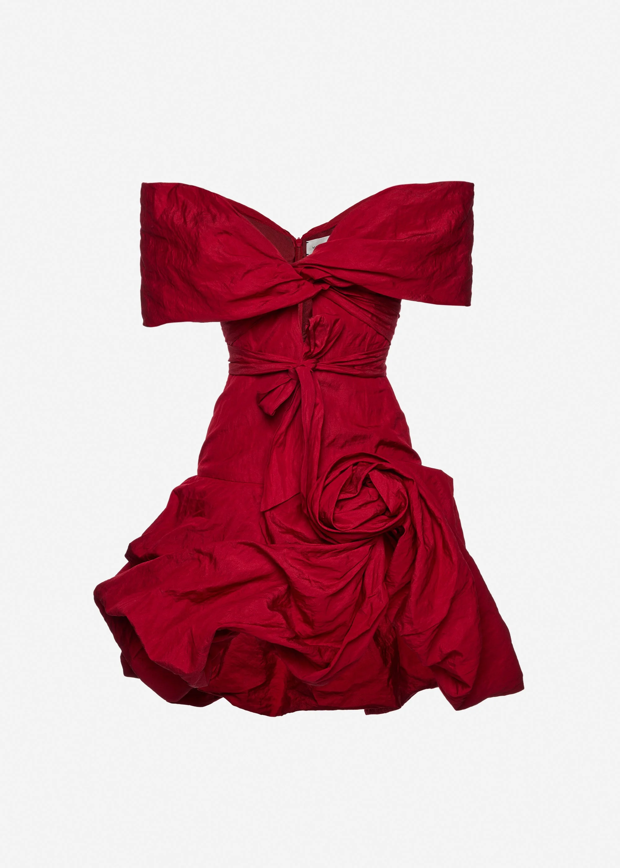 A knee-length dress defined by a dramatic draped shawl collar that frames the shoulders and reveals a deep neckline at the front and back. The fitted bodice is sharply contoured at the waist, while elasticated internal straps secure the off-shoulder silhouette. Below, the skirt is richly gathered and drawn inward to create a voluminous bubble effect, finished with a hand-draped floral twist at the left hip. Long self-tie sashes add movement and styling versatility. Designed with discreet side-seam pockets and a concealed center-back zip for a refined finish. Details ID: 101526 Shell 90% Cotton 10% Metal. Lining 100% Silk. Sizing This piece has a slim fit. Model is wearing a size 34.