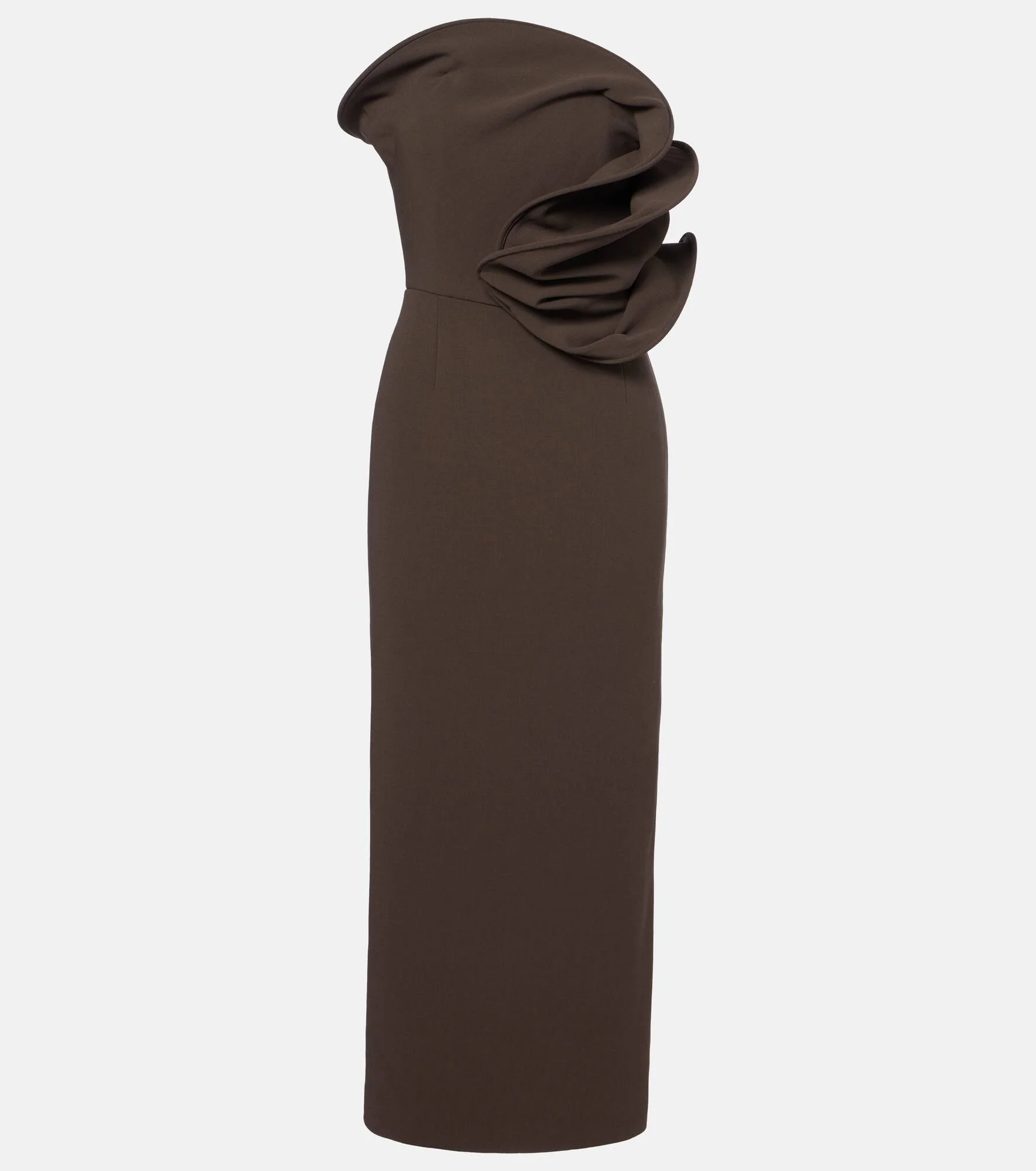 Magda Butrym aims to empower with sharp modern style, expertly delivered through artisanal excellence. Crafted from a soft wool blend, this cocktail dress boasts a strapless silhouette with elegant draping that creates a flower-like detail. Product Details - Material: 96% wool, 4% elastane - Care instructions: dry clean - Made in Poland - Designer color name: Brown - Item color: brown - Closure: invisible zipper - Boning - Long vent - Item number: P01120836 Size & Fit - Fits large to size - we recommend trying one size smaller - Strapless - Internal laced corset for support - Internal boned corset for support - Fitted - Stretchy fabric - Height of model is 180cm-71" and wears a size FR 34