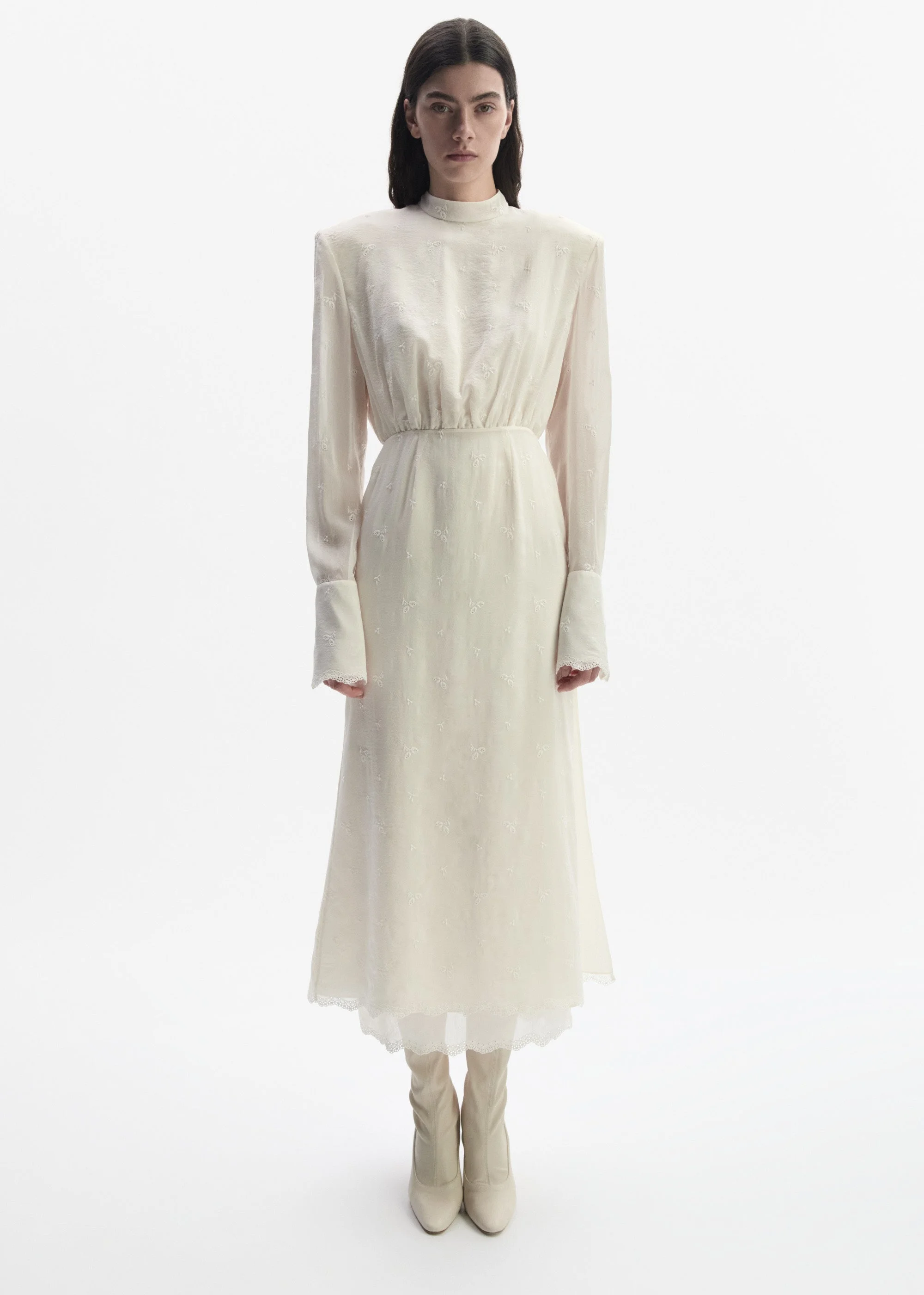 A refined midi dress crafted from delicately embroidered fabric, falling to mid-calf. Designed with a high stand collar and a softly blousoned bodice gathered at the waist for fluid volume. The silhouette is gently flared below the waist, while padded shoulders add subtle structure. Long sheer sleeves are finished with wide cuffs fastening with a single button. Fully lined through the body, with transparent sleeves for lightness. Fastens at the center back with a concealed zipper and features a discreet side slit for ease of movement. Details ID: 216526 Shell 40% Silk 30% Wool 20% Cotton 10% Polyester Lining 55% Polyester Rec 45% Polyester Sizing This piece has a regular fit. Model is wearing a size 34.