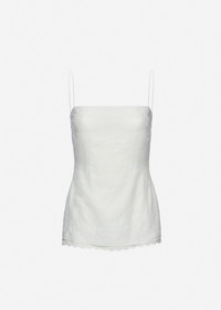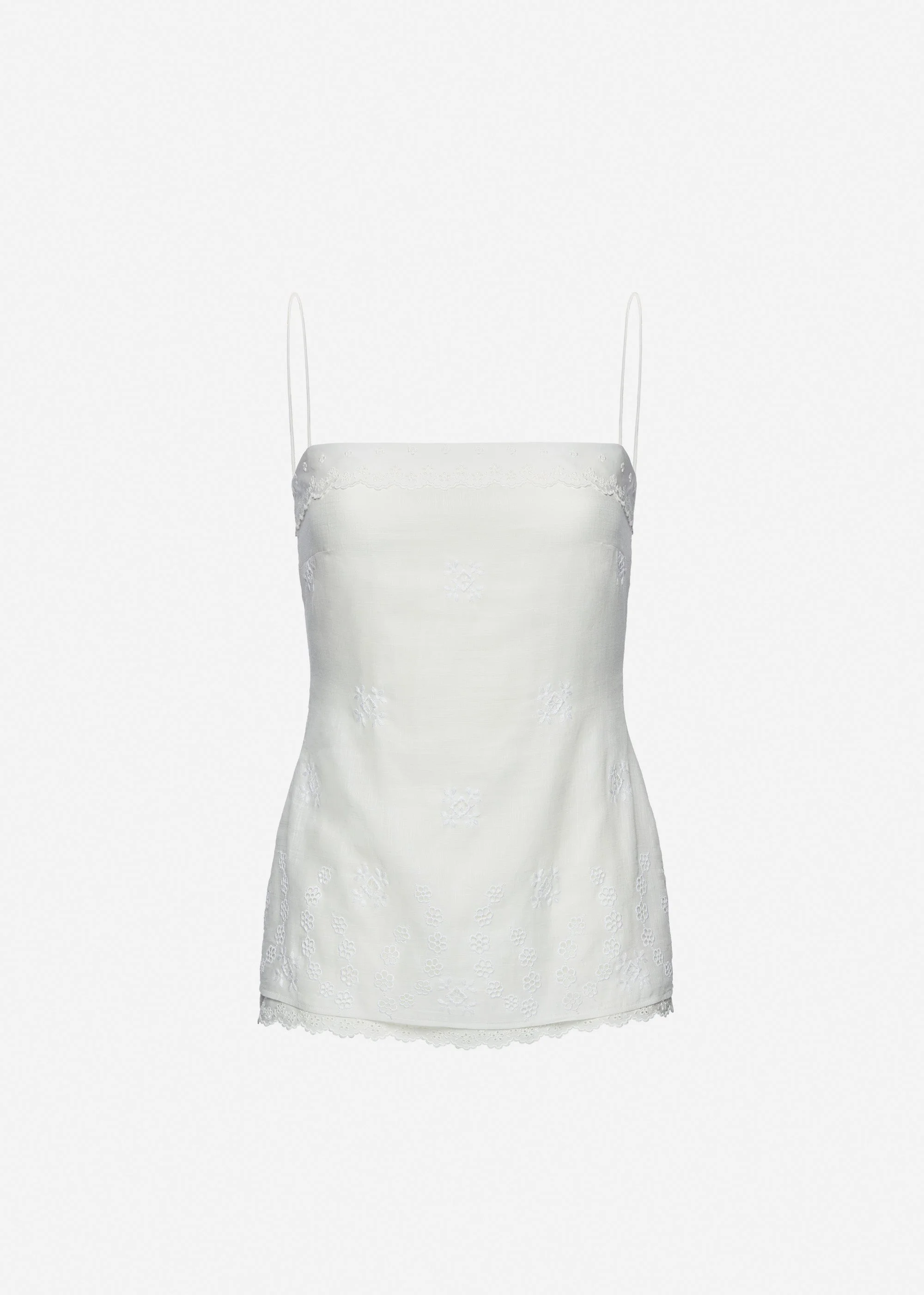 A fitted top crafted from a soft cotton and linen blend, defined by delicate floral embroidery and a feminine, tailored silhouette. The straight neckline is framed with a wide lace trim, mirrored at the hem where the lining’s edge subtly peeks through. Finished with fine straps and a concealed zip at the back. Details ID: 337426 Shell 65% Cotton 34% Linen 5% Polyester Lining 100% Silk Sizing This piece has a slim fit. Model is wearing a size 34.