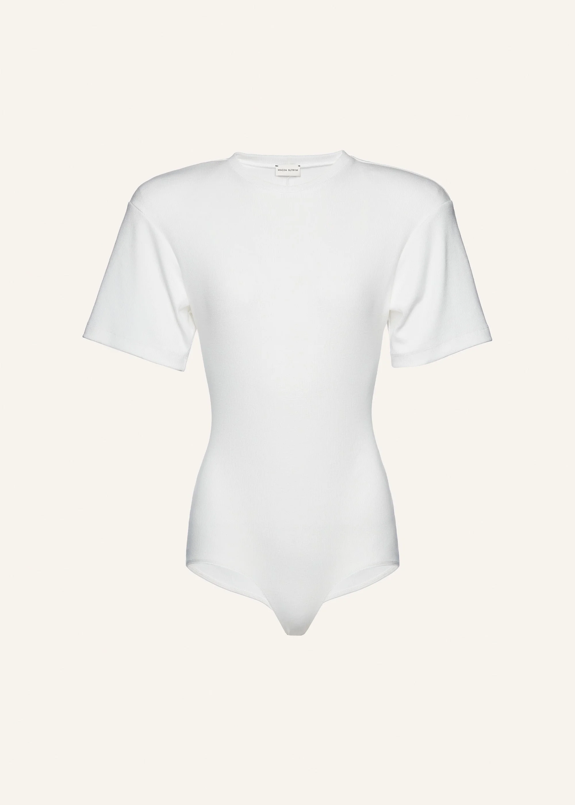Magda's signature bodysuit features removable padded shoulders, short sleeves, and a fitted body to create her signature silhouette. Ribbed fabric and a round neckline complete the look. Details ID: 169425 Shell 95% Cotton 5% Elastane. Lining 100% Cotton. Sizing This piece fits true to size. We recommend you get your regular size. Model is 180 cm and is wearing a size 34.