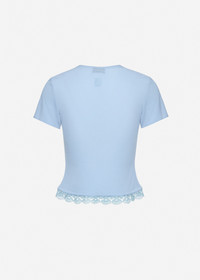 A short, fitted T-shirt made from soft cupro fabric with a smooth, lightweight finish. Designed with a classic round neckline and delicate crochet trim along the hem for a feminine touch. The back features Magda Butrym’s flower logo just below the neckline. Details ID: 195426 Shell 92% Cupro 8% Elastane. Sizing This piece has a regular fit. Model is wearing a size 34.