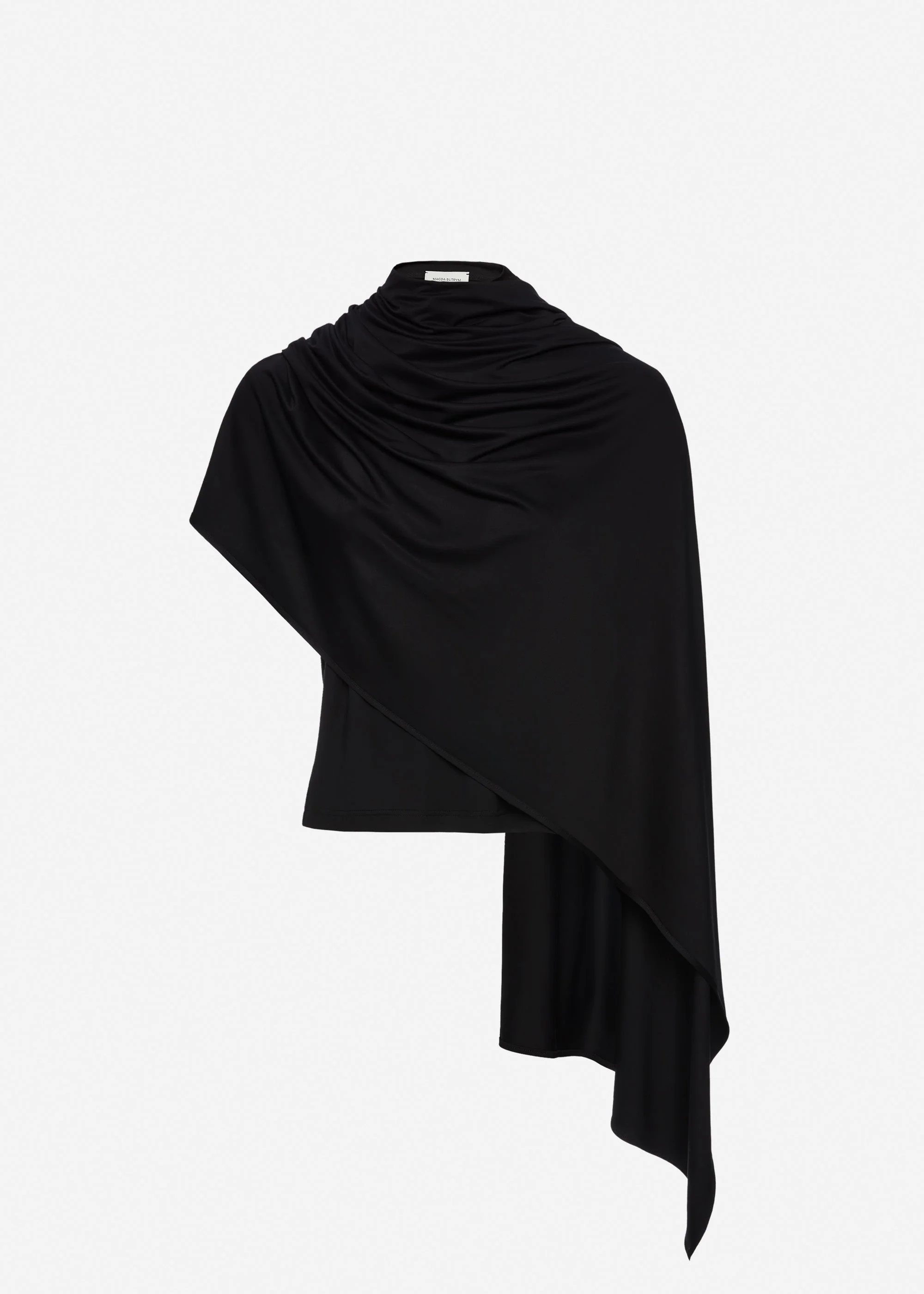 A short, fitted T-shirt with a wide crew neckline and an attached long pleated scarf draped along the back neckline for an elegant, fluid effect. Finished with Magda Butrym’s embroidered flower logo below the back collar. A modern take on a classic silhouette with a distinctive feminine twist. Details ID: 279426 Shell 96% Viscose 4% Elastane Sizing This piece has a regular fit. Model is wearing a size 34.