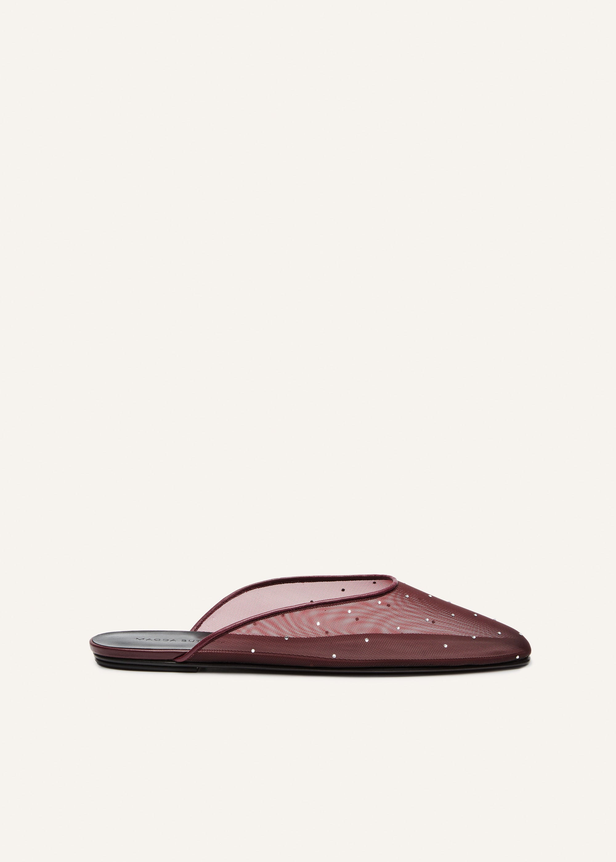 Crystal mesh flat mules in burgundy