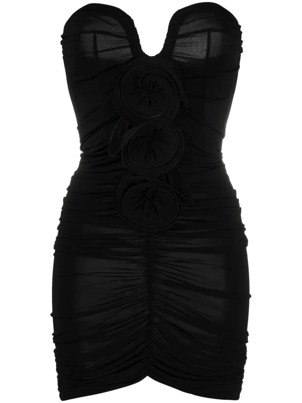 floral-applique ruched minidress A signature take on the little black dress, this piece by Magda Butrym is embellished with the label's hallmark 3D flower appliques through the front. It's crafted with a sculptural neckline, boned for structure and enhanced with all-over ruching for added dimension. Highlights - Black - Silk blend - Ruched detailing - Floral applique - Bustier-style neckline - Strapless - Rear zip fastening - Thigh-length - Asymmetric hem Imported Composition Outer: Viscose 91%, Spandex/Elastane 9% Lining: Silk 90%, Spandex/Elastane 10% SIZE & FIT Measurement HIPS 33.07 in(84 cm) LENGTH 25.19 in(64 cm) WAIST 25.19 in(64 cm) Washing instructions Dry Clean Only