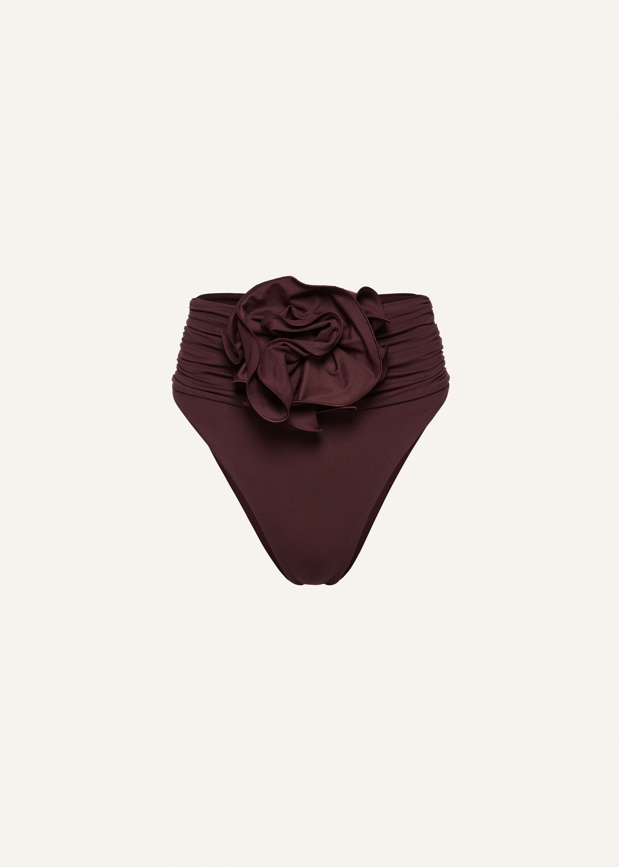 A high-waisted, high-leg swim bottom with a ruched, belt-like detailing which gathers at the center and features a large removable flower applique, which can also be pinned onto matching bandeau tops. Details ID: 310525 Shell 91% Polyamide 9% Elastane Sizing This piece fits true to size. We recommend you get your regular size. Model is 174 cm and is wearing a size 34.