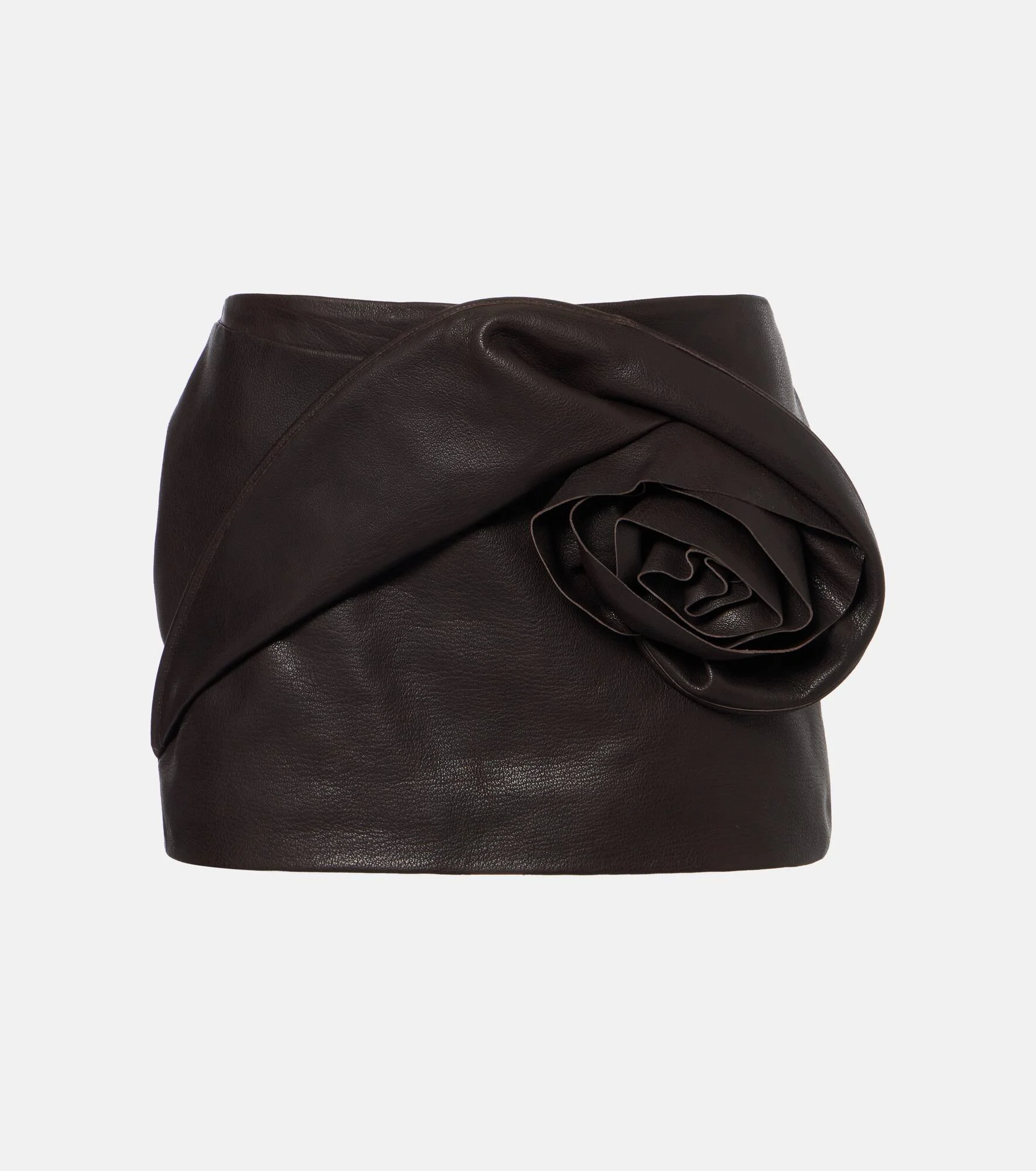 Floral appliques have become something of a Magda Butrym signature, appearing artfully on the brand's most coveted designs. One is designed as the focal point of this miniskirt, made in Poland from dark brown leather. Product Details - Material: 100% sheep leather - Care instructions: specialist clean - Made in Poland - Color: brown - Designer color name: Brown - Lining: 100% viscose - Closure: concealed zipped back - Pockets: back pockets - Item number: P01130904 Size & Fit - True to size - Non-stretchy fabric - Sits low on the hips - The model seen in the picture is 178cm-5'10" and wearing a size FR 36