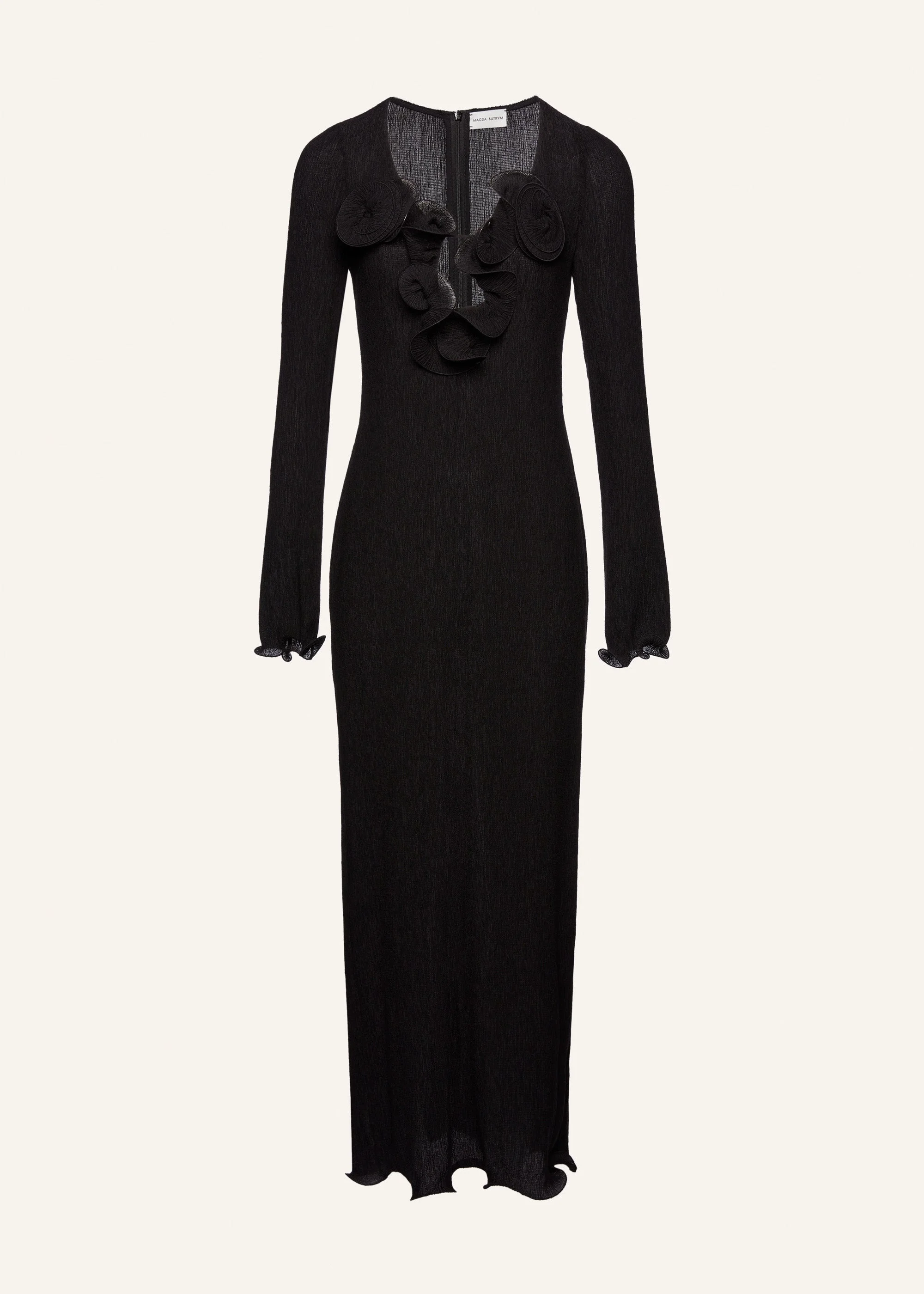 A long sleeve midi dress with a deep 3D flower decollete and ruffled finish, cut from seasonal shirred fabric for a delicate texture. Details ID: 131523 Shell 59% Lyocell, 40% Polyester, 1% Elastane. Lining 100% Silk Sizing This piece fits true to size. We recommend you get your regular size. Model is 181 cm and is wearing a size 34.