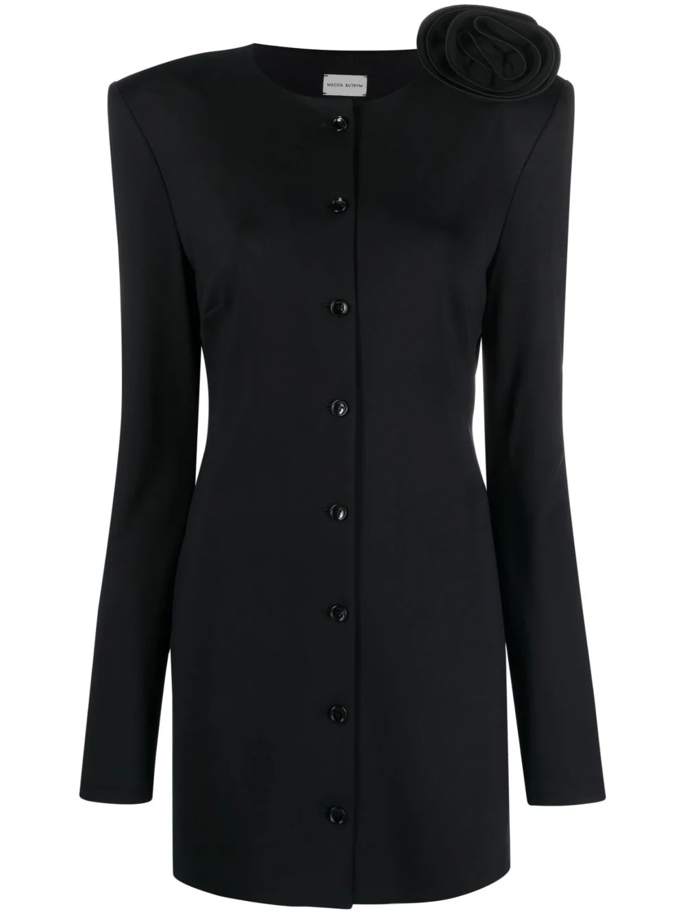 floral applique minidress Magda Butrym's minidress is punctuated by its exaggerated shoulders and rose-shaped applique - a brand signature. Arriving in a black colourway, the piece is framed by long sleeves and fastens with a row of tonal buttons through the front. Highlights - Black - Round neck - Long sleeves - Floral applique - Front button fastening - Straight hem Imported Composition Viscose 97%, Elastane 3%