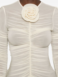 floral-applique top Highlights - Light beige - Lightweight jersey - Sheer - V-neck - Floral applique - Ruched detailing - Rear hook and eye fastening - Long sleeves - Fitted waistline - Asymmetric hem Imported Composition Cupro 92%, Elastane 8% SIZE & FIT Model measurements Height 5 ft 9 in(1.76 m) Bust/Chest 32.28 in(82 cm) Hips 35.03 in(89 cm) Waist 24.8 in(63 cm) FittingInformation Designed for a close fit throughout Made from a lightweight stretch fabric, this piece offers elasticity and flexibility when worn This piece fits true to size – take your usual size