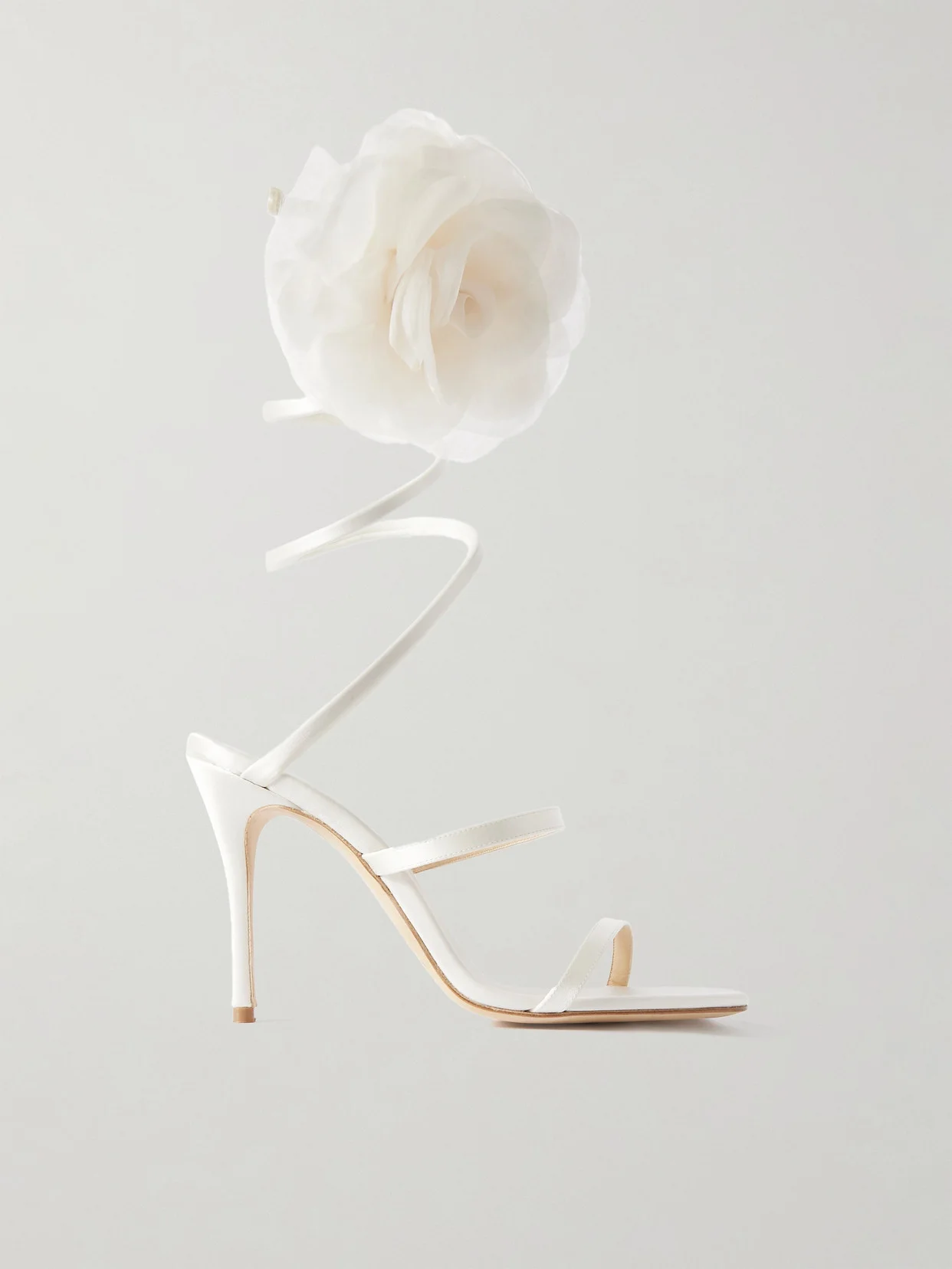 Magda Butrym's sandals are such a unique choice for your wedding day - they have a coiled strap that traces up the ankle and is decorated with the signature rose applique. Crafted from white satin, they're lined in smooth leather and rest on 105mm heels.