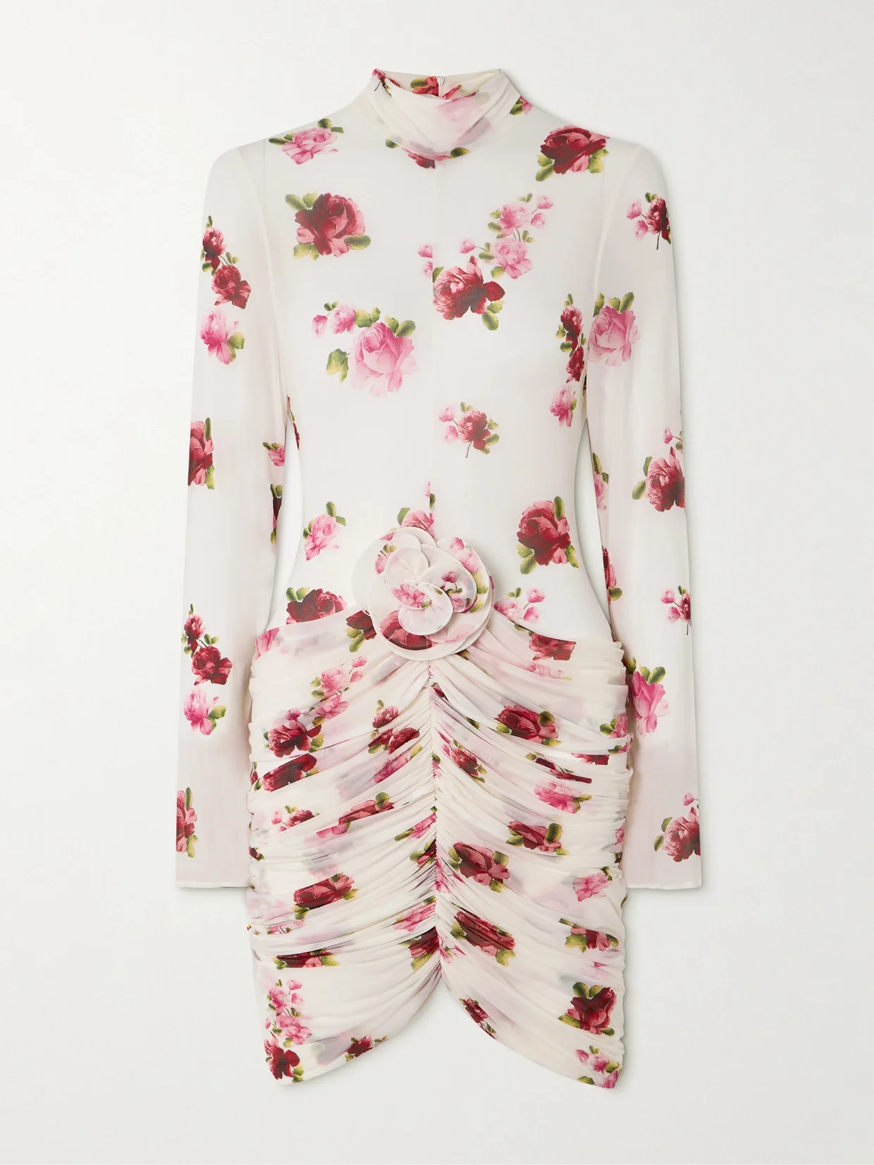 Appliquéd Gathered Floral-print Tulle Mini Dress