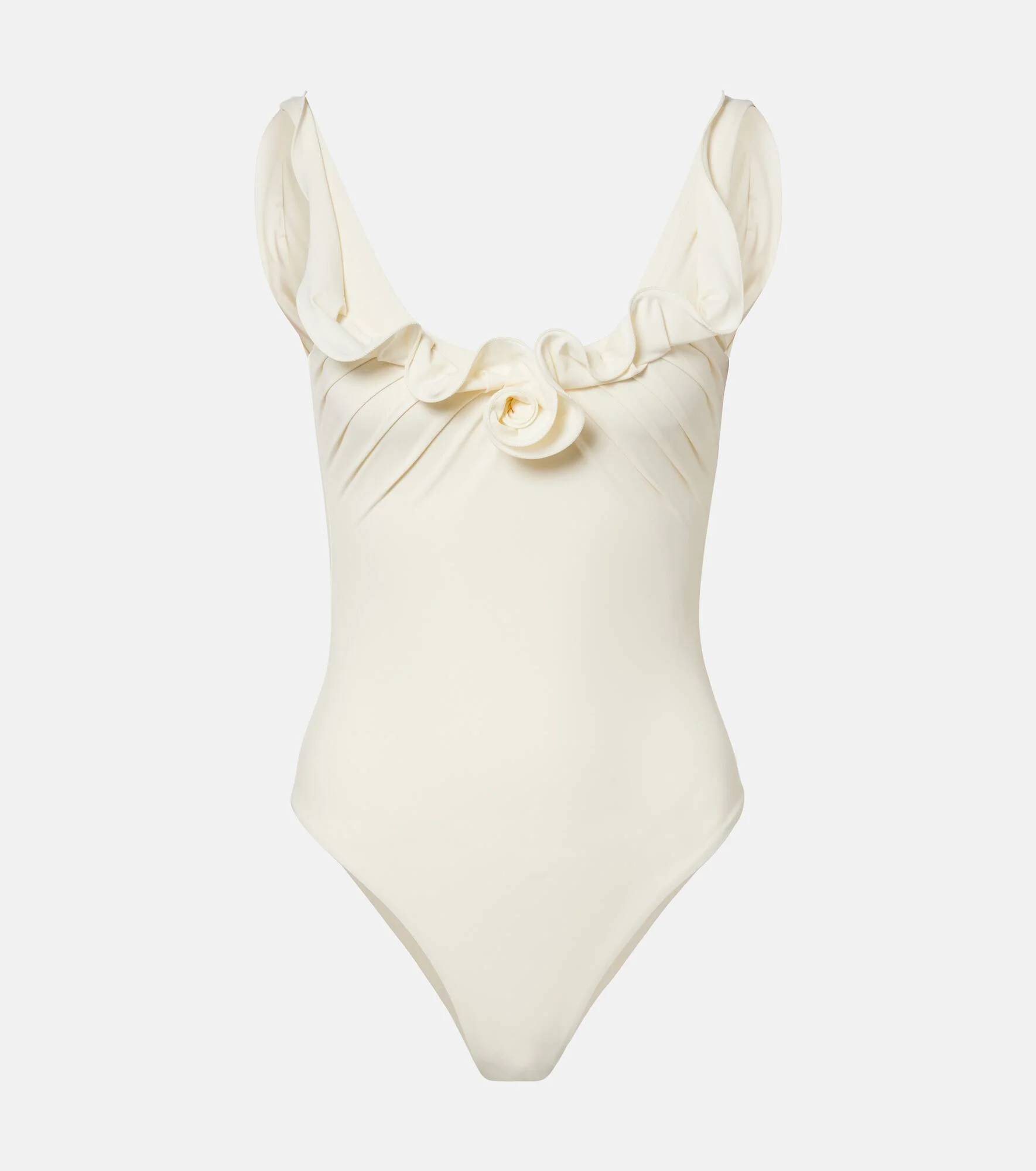 Floral appliques have become something of a Magda Butrym signature, appearing artfully on the brand's most coveted designs. This swimsuit features a sculptural silhouette with a tonal rosette adorning the scoop neckline. Product Details - Material: 75% polyamide, 25% elastane - Care instructions: machine wash at 30 degrees - Made in Italy - Color: white - Designer color name: Cream - Item number: P01130923 Size & Fit - True to size - Unpadded Top - High-cut leg - The model seen in the picture is 178cm-5'10", cup size B, and wearing a size FR 36