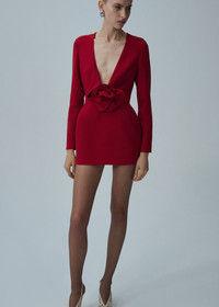 Made from wool, this long-sleeve mini dress has a deep v neckline with a floral applique at the waist. Details ID: 475525 Shell 96% Wool 4% Elastane Lining 100% Silk Sizing This piece fits true to size. We recommend you get your regular size. Model is 182 cm and is wearing a size 34.