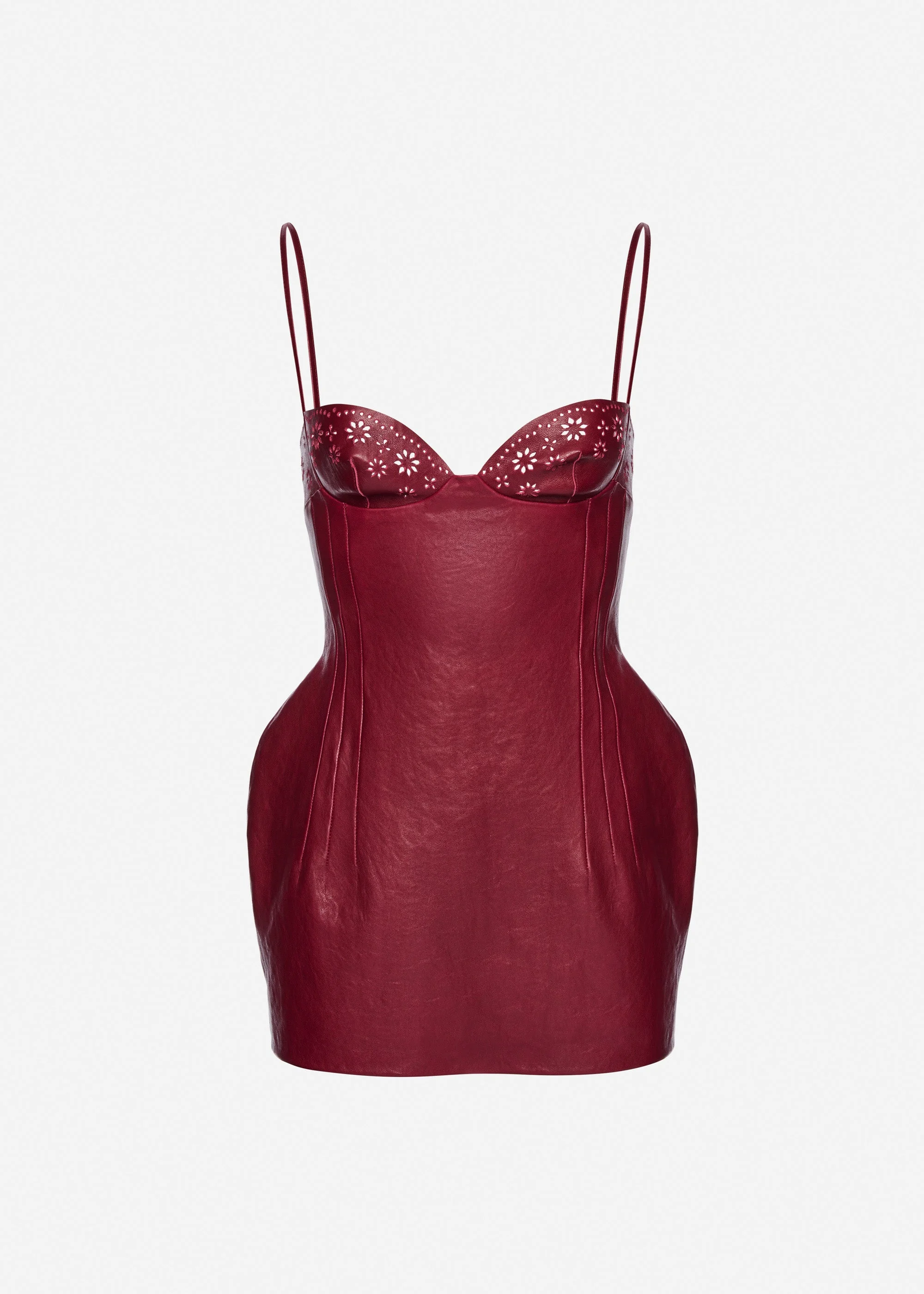 A fitted mini dress crafted from supple leather with shaped cups and delicate perforated detailing. The silhouette is precisely contoured with seam lines that emphasize the waist and subtly enhance the hips, creating a strong, feminine form. Finished with thin straps and a clean, minimal hem. Details ID: 454526 Shell 100% Sheep Leather. Lining 100% Viscose. Sizing Model is wearing a size 34.