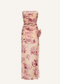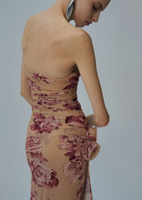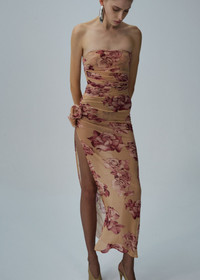 A strapless cupro midi dress with a flattering ruched bodice and a high leg slit, finished with a rose applique at the waist. Details ID: 163525 Shell 92% Cupro 8% Elastane. Sizing This piece fits true to size. We recommend you get your regular size. Model is 182 cm and is wearing a size 34.