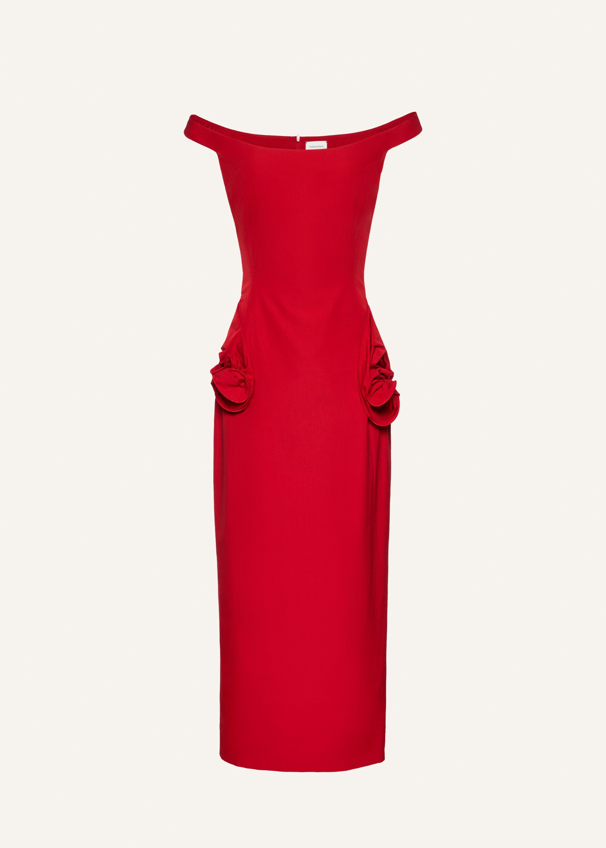 An off shoulder fitted midi dress with circle cutouts at the hip, which are further adorned with rose appliques. Details ID: 472525 Shell 56% Cupro 44% Viscose Lining 100% Silk Sizing This piece fits true to size. We recommend you get your regular size. Model is 182 cm and is wearing a size 34.