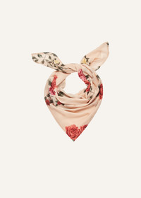 A cupro scarf in peach color featuring a seasonal rose print, ideal for styling around the neck or head to add a floral touch to any outfit. Details ID: 294425 Shell 90% Silk 10% Elastane. Sizing Approximate measurements: 73cm x 73cm