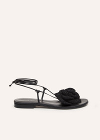 The signature Magda Butrym flower shoe is reimagined as a simple flat sandal, with strappy detailing and long wrap tie ankle straps. The crochet flower brooch is handmade by Magda's team of handweaving artisans, reflecting an important element of the brand's DNA. Nappa leather upper and sole. Details ID: 518523 Upper: Lamb Leather (Ovis Aries) 100%. Insole, Sole: Calf Leather 100%. Flower: 75% Cotton 25% Sizing This piece fits true to size. We recommend you get your regular size.