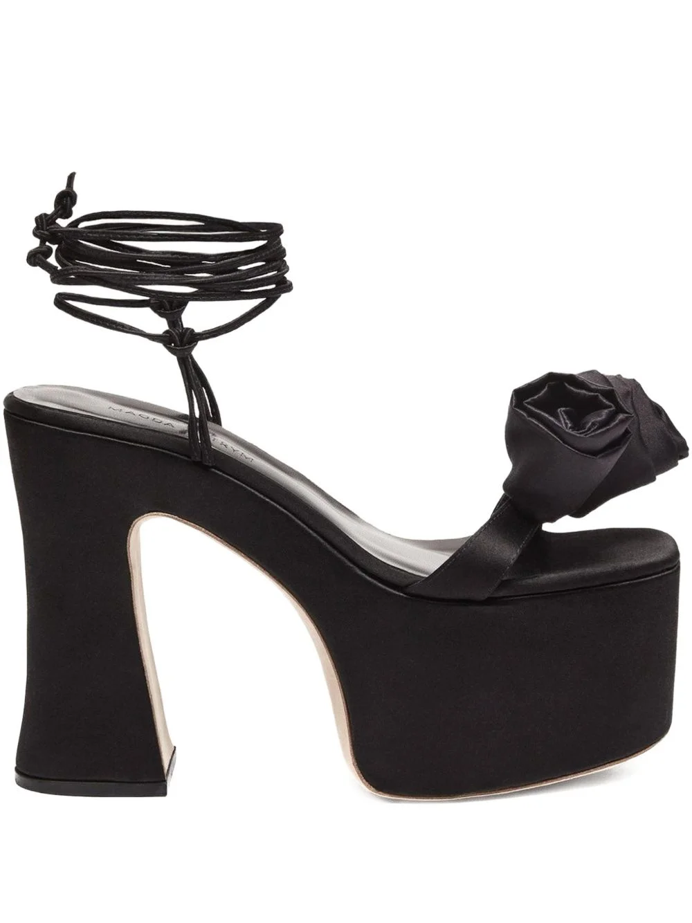 flower platform sandals Highlights - Black - Flower detail - Block heel - Wrap-around ankle strap Imported Composition Outer: Silk 100% Lining: Calf Leather 100% Sole: Calf Leather 100% SIZE & FIT Measurement HEEL 5.51 in(14 cm)