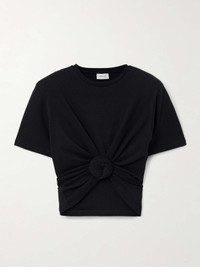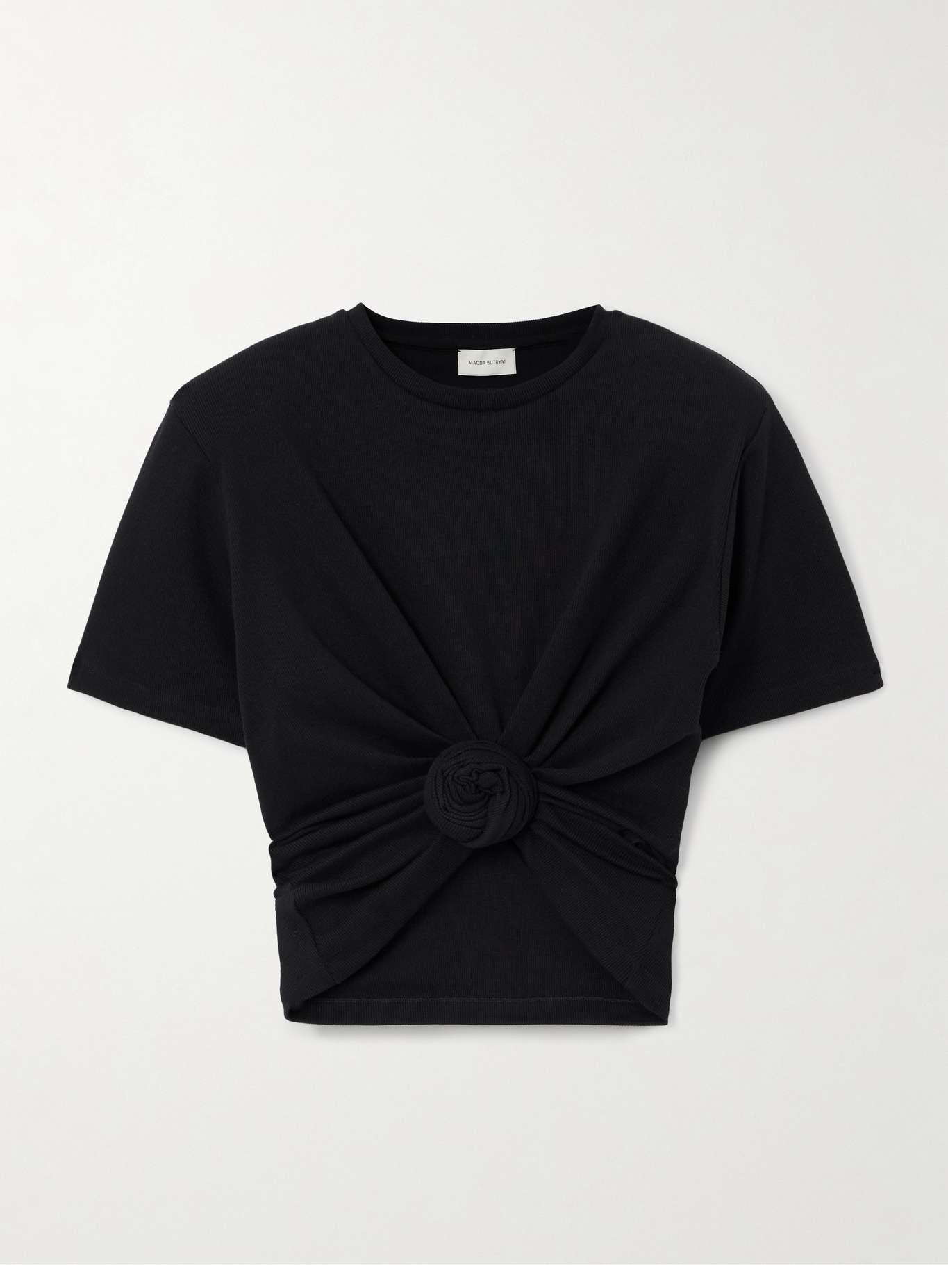 EDITORS'NOTES Magda Butrym’s T-shirt is classic, with a twist. It's made from ribbed cotton-blend jersey, gathered into a rose and has detachable shoulder pads if you wish to add a hint of structure. SIZE & FIT Model measurements: - Fits true to size, take your normal size - Designed for a slightly loose fit - Internal shoulder pads - Lightweight, slightly stretchy fabric - Model is 180cm/ 5'11" and is wearing a FR 34 - Bust: 85cm/ 33.5" - Waist: 62cm/ 24.5" - Hip: 88cm/ 34.5" DETAILS & CARE - Black cotton-blend jersey - Slips on - 95% cotton, 5% elastane - Dry clean
