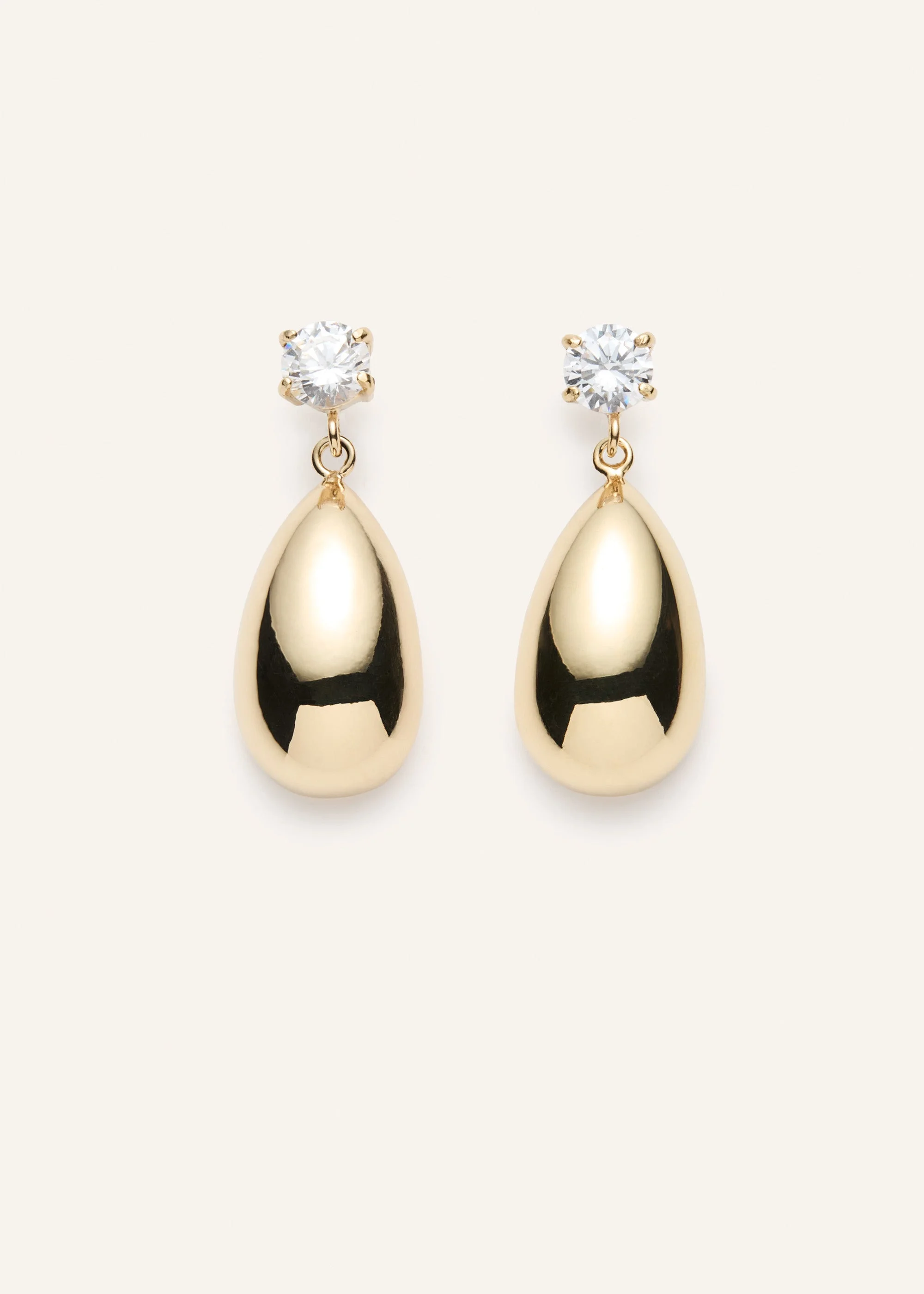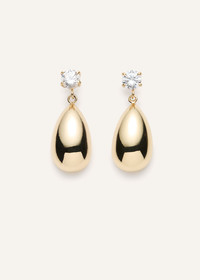 These elegant earrings feature a brilliant crystal stud that anchors a sleek, polished gold-tone teardrop charm. The minimalist silhouette and radiant finish make them a versatile accessory for both everyday elegance and sophisticated evenings. For pierced ears. Details ID: 711725 Hypoallergenic Goldplated Brass. Sizing Approximate measurements: 1,5 cm width, 4 cm drop.