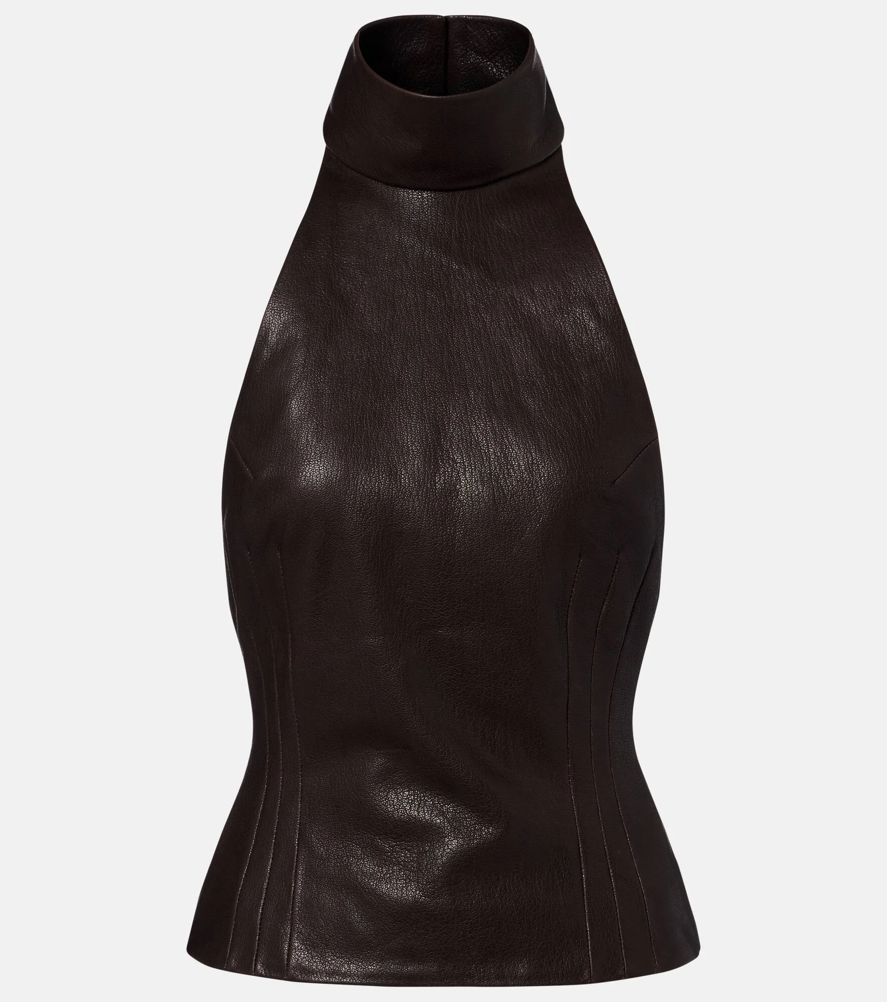 Magda Butrym aims to empower with sharp modern style, expertly delivered through artisanal excellence. This top is cut from grained lamb leather to a halterneck silhouette and finished with seamed panels along the sides. Product Details - Material: 100% lamb leather - Care instructions: specialist clean - Made in Poland - Color: brown - Designer color name: Brown - Item color: brown - Lining: 100% viscose - Closure: buttoned back, zipped back - Hardware color: silver - Item number: P01130906 Size & Fit - Fits large to size - we recommend trying one size smaller - Low back - Cinched waist - Non-stretchy fabric - Falls to the hip - The model seen in the picture is 178cm-5'10" and wearing a size FR 36