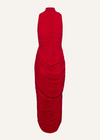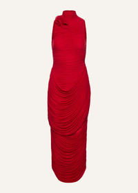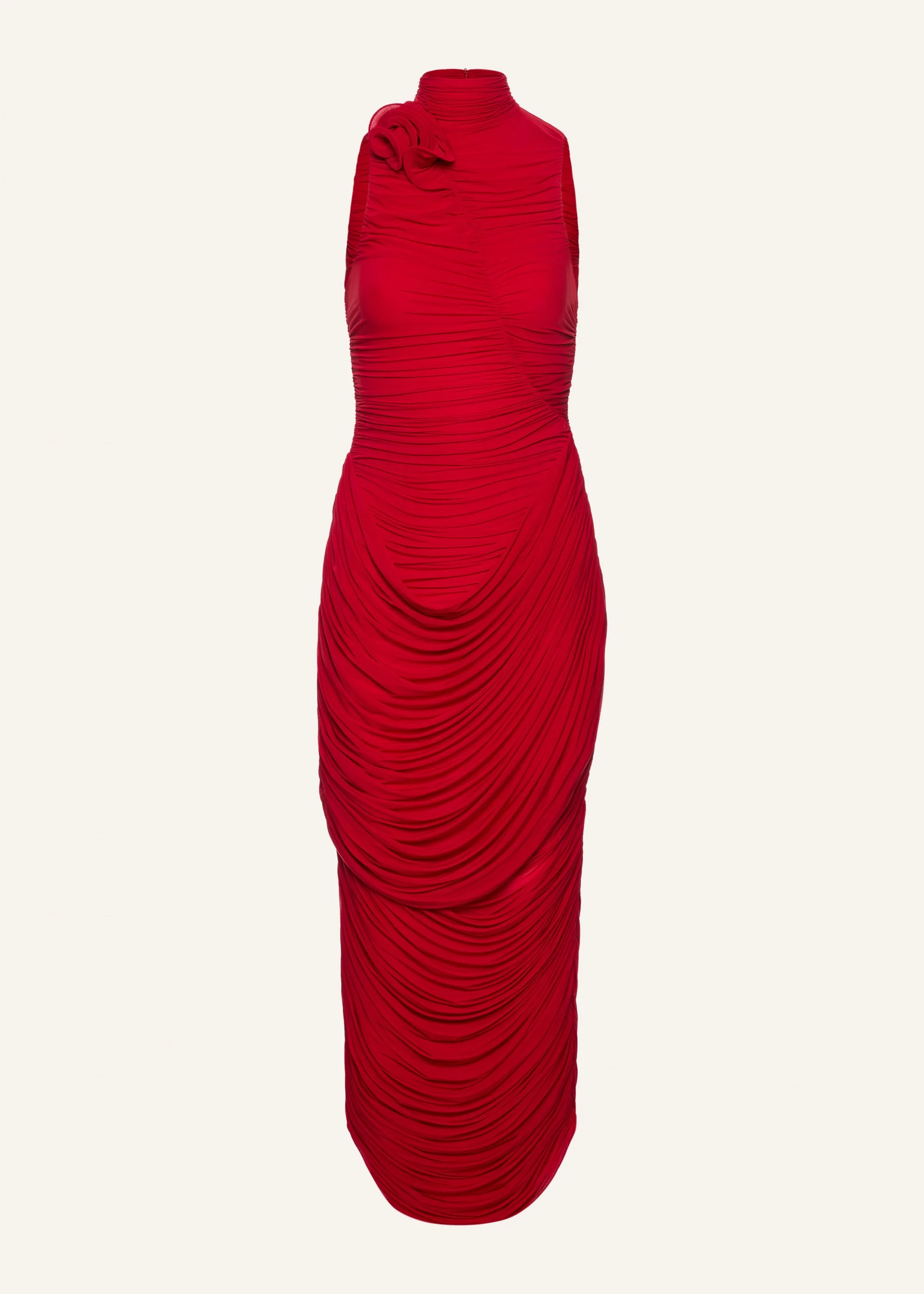 This sleeveless midi dress features a ruched high neckline and sculptural floral detailing at the front. Expertly draped throughout, with gathered seams at the sides, back, and hips, the silhouette is enhanced by layered ruching that adds dimension and movement. Finished with a concealed zip closure at the back and an interior bodysuit for structure and support Details ID: 238925 Shell 92% Cupro 8% Elastane. Sizing This piece fits true to size. We recommend you get your regular size. Model is 177 cm and is wearing a size 34.
