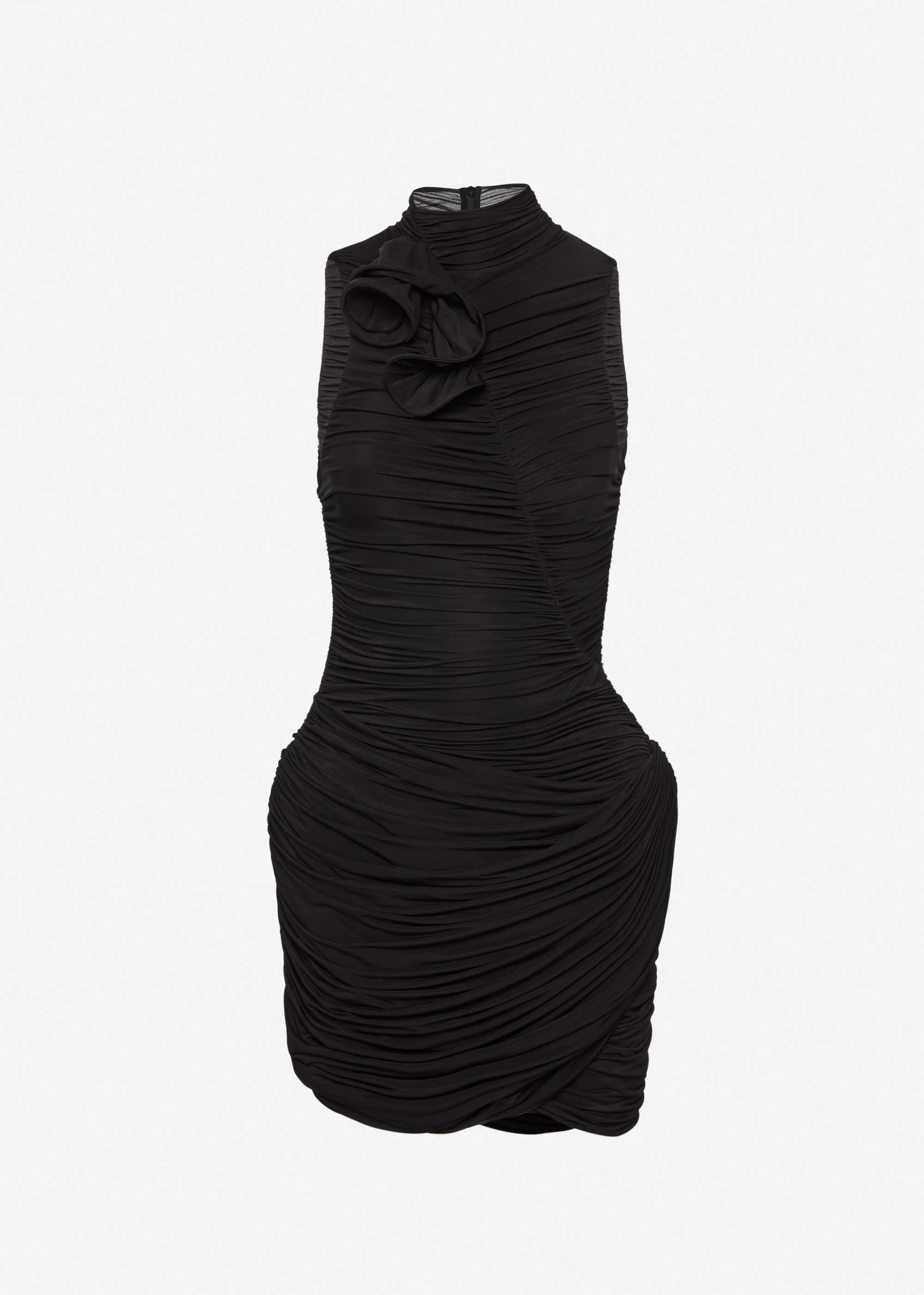 A figure-hugging mini dress with a ruched high neckline and sculptural detailing throughout. A handcrafted floral applique adorns the neckline, while additional draped overlays at the hips add volume and movement. Subtle padding accentuates the hips for a sculpted effect. Finished with a concealed back zip and an integrated bodysuit for a seamless fit. Details ID: 453526 Shell 92% Cupro 8% Elastane. Sizing This piece has a slim fit. Model is wearing a size 34.