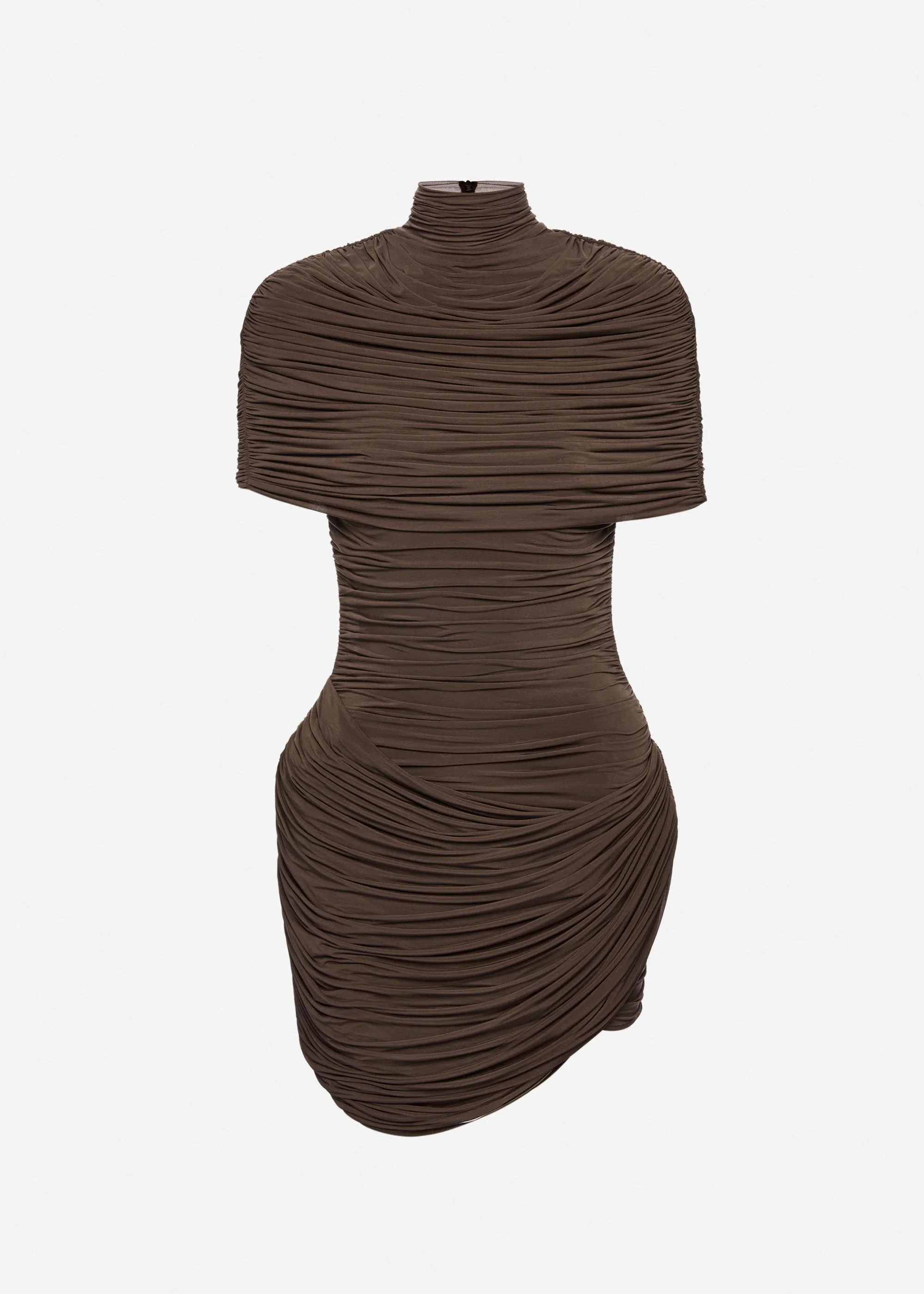 A sculptural mini dress crafted with rich, all-over draping that defines the body with fluid precision. Designed with a high stand collar and a gathered cape overlay across the shoulders, the silhouette is enhanced by raglan-style shoulder padding and softly accentuated hips supported with internal padding. The dress features a built-in bodysuit for a seamless, body-hugging fit and fastens at the center back with a concealed zipper. Details ID: 344526 Shell 92% Cupro 8% Elastane Sizing This piece has a slim fit. Model is wearing a size 34.