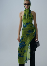 A high-neck midi dress with a loosely draped halter neck and a high-leg slit, with a floral applique at the hip and fabric button closure detailing. Details ID: 189725 Shell 92% Cupro 8% Elastane. Sizing This piece fits true to size. We recommend you get your regular size. Model is 180 cm and is wearing a size 34.