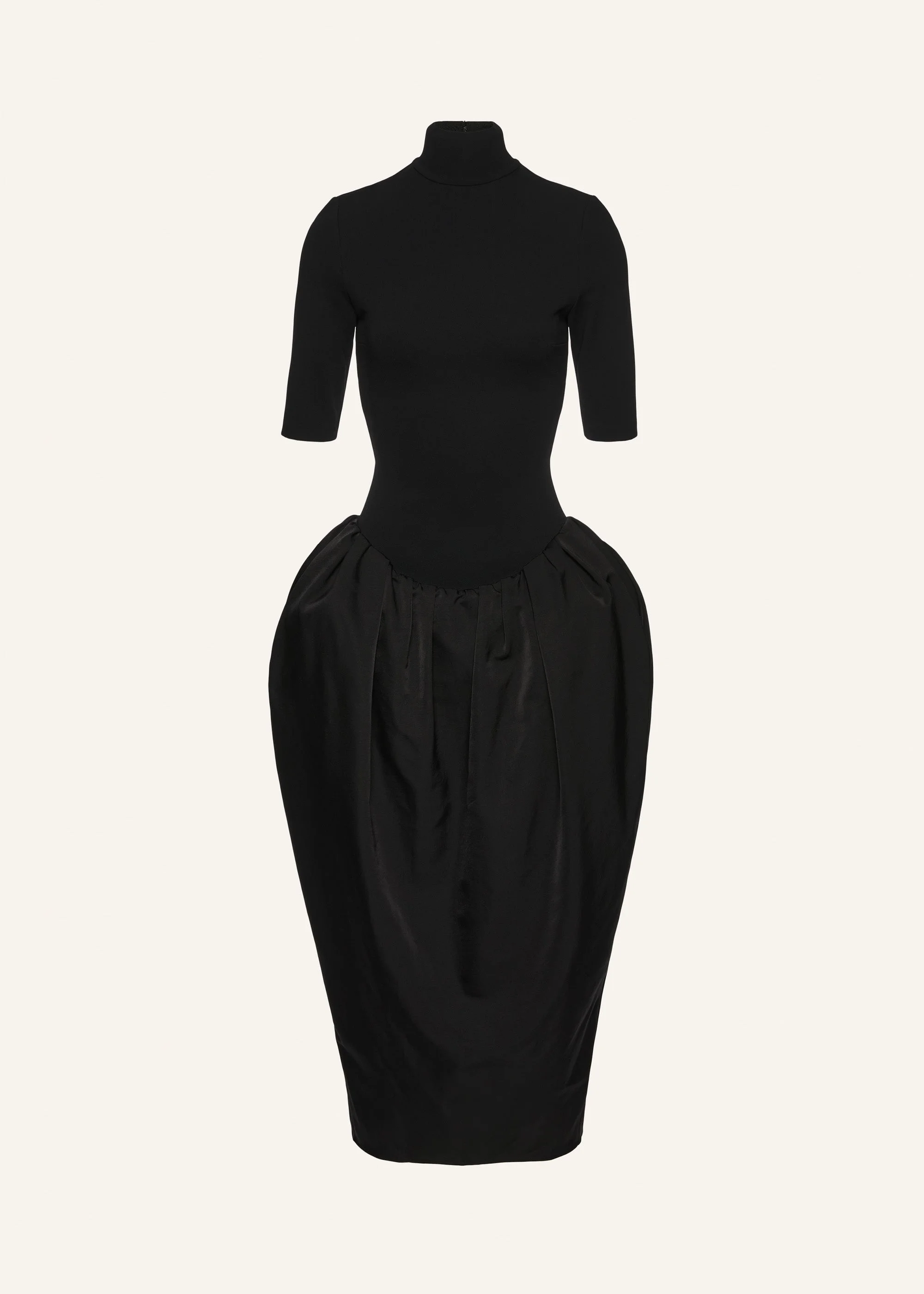 A form-fitting midi dress that combines a structured silhouette with dramatic volume. It features a sleek turtleneck and fitted 3/4 sleeves, contrasted by a voluminous skirt with a high slit at the back. The bodysuit base fastens underneath the skirt. Details ID: 180925 Shell [1] 92% Cupro 8% Elastane [2] 51% Cotton 49% Silk Sizing This piece fits true to size. We recommend you get your regular size. Model is 177 cm and is wearing a size 34.